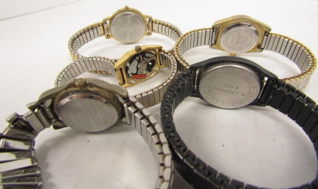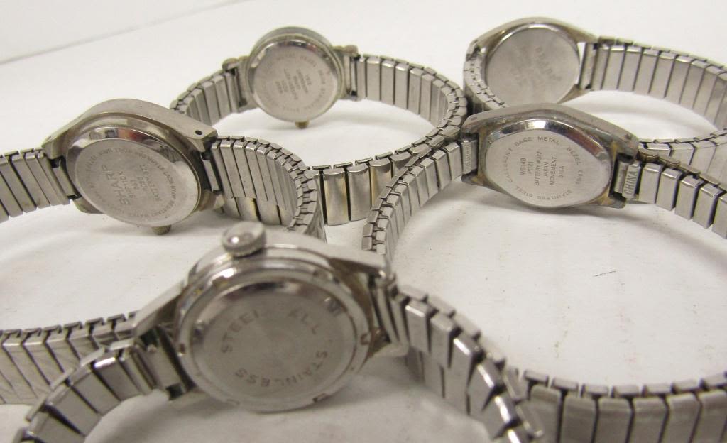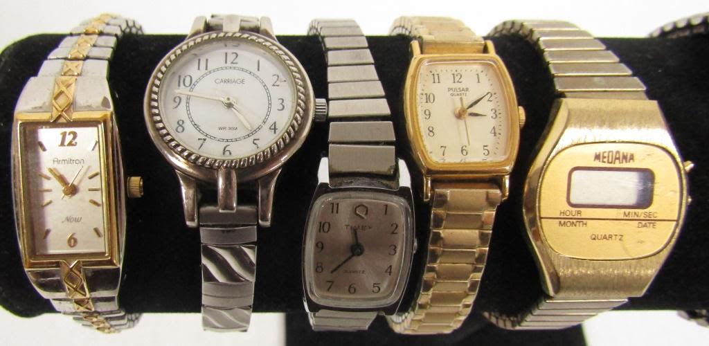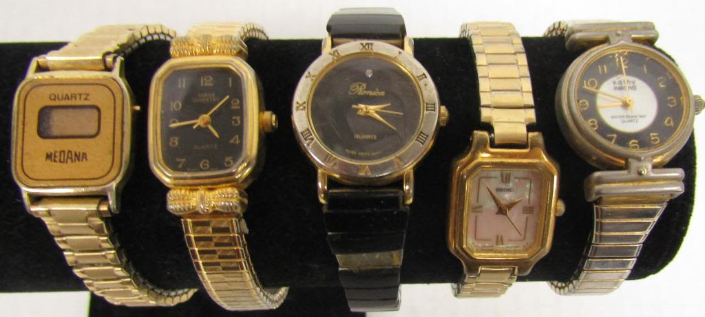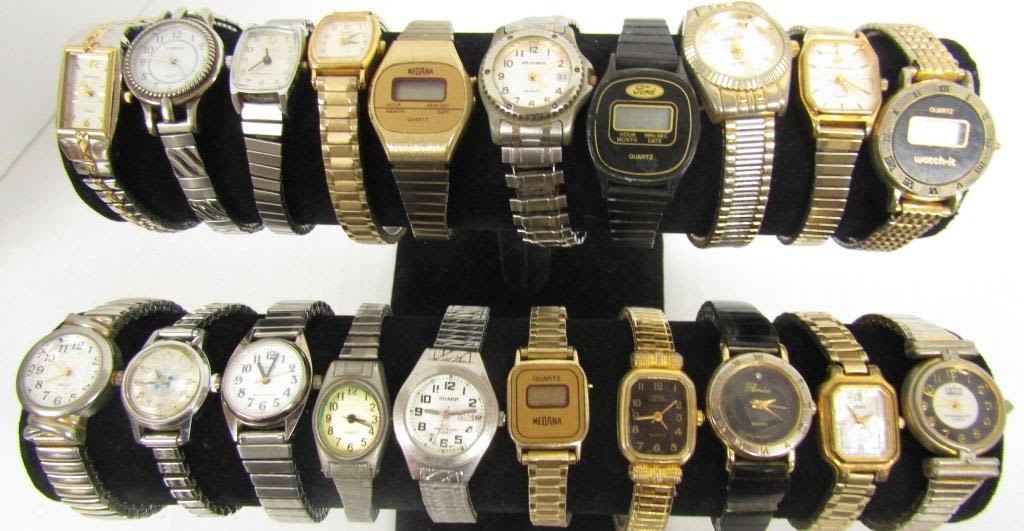 20 LADIES QUARTZ WATCHES-NOT TESTED AS TO WORKING OR NOT-SOME FOR PARTS OR REPAIR-SOME MAY WORK–(2)WATCH IT, SARAH COVENTTRY, PULSAR, (2)MEDANA, MILAN, RONICA, (2)SH ARP, KATHY IRELAND, SEIKO, TULE