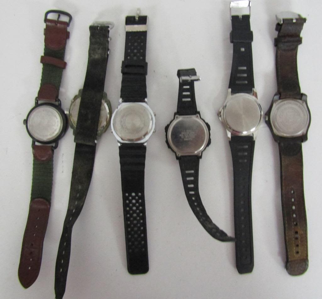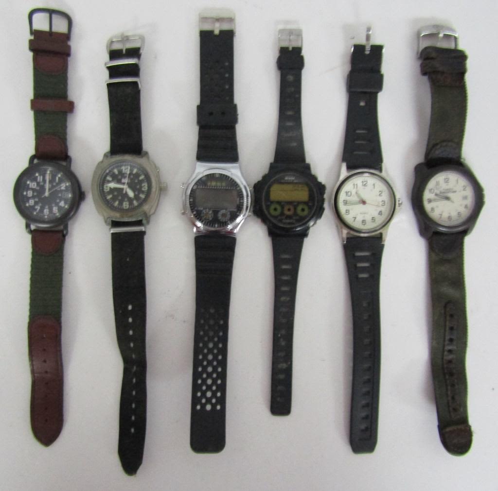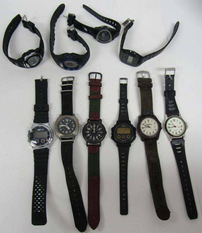 Not tested as to working or not-some for parts or repair-some may work-most will need battery replacements-10 Mens Quartz Wrist Watches(2)Casio-Armitron-Swiss Army-Timex Ecpedition-misc