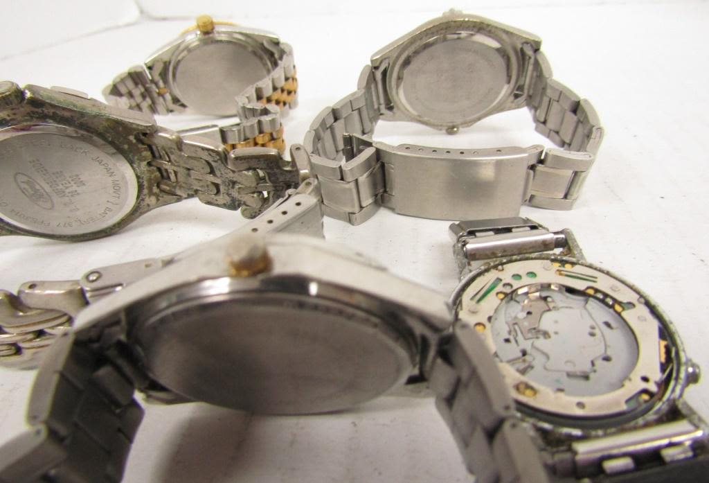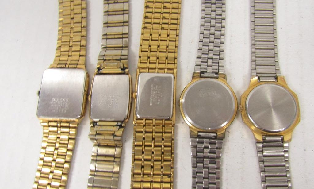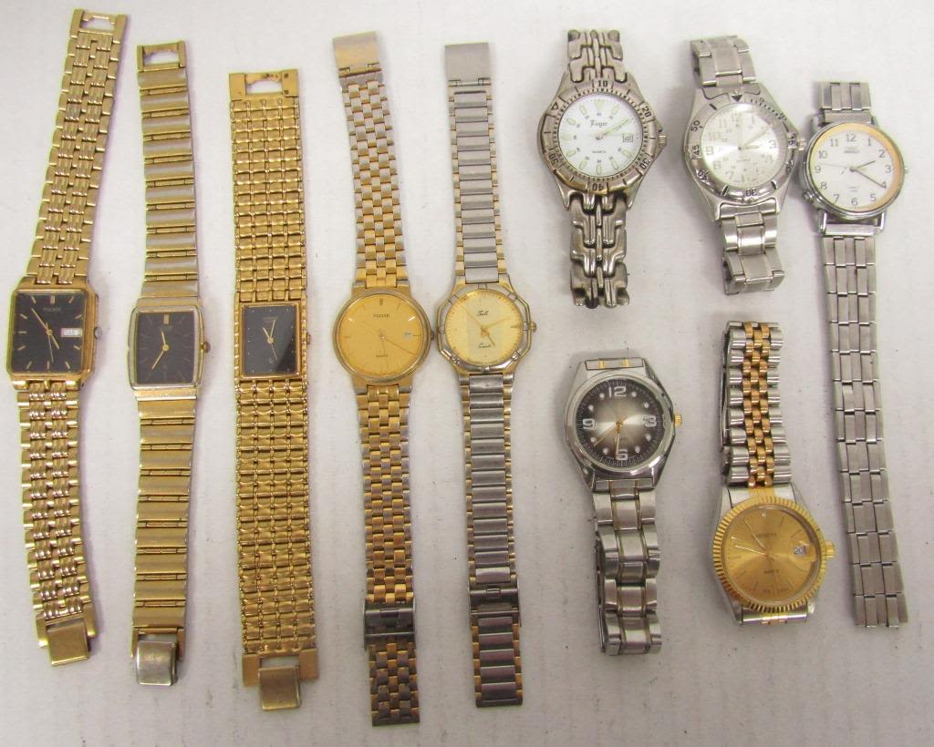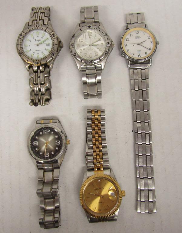10 MENS QUARTZ WATCHES-NOT TESTED AS TO WORKING OR NOT-SOME FOR PARTS OR REPAIR-SOME MAY WORK–LUGER, GENEVA, TIMEX, TALI, (2)CITIZEN, (2)PULSAR, ECT