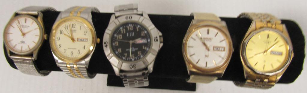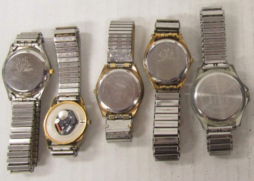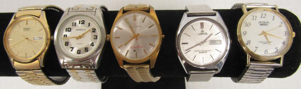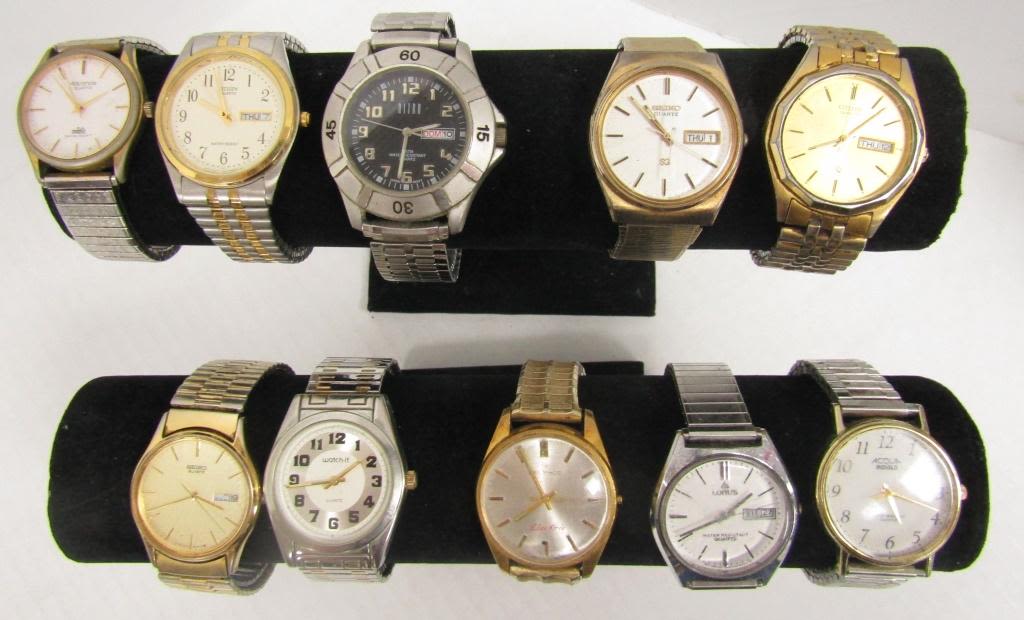 10 MENS QUARTZ WATCHES-NOT TESTED AS TO WORKING OR NOT-SOME FOR PARTS OR REPAIR-SOME MAY WORK-ADVANCE, WATCH IT, LORUS, NITRO, ACQUE, HELBROS, (2)SEIKO, (2)CITI ZEN