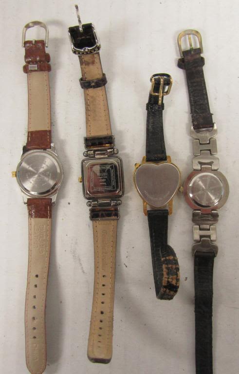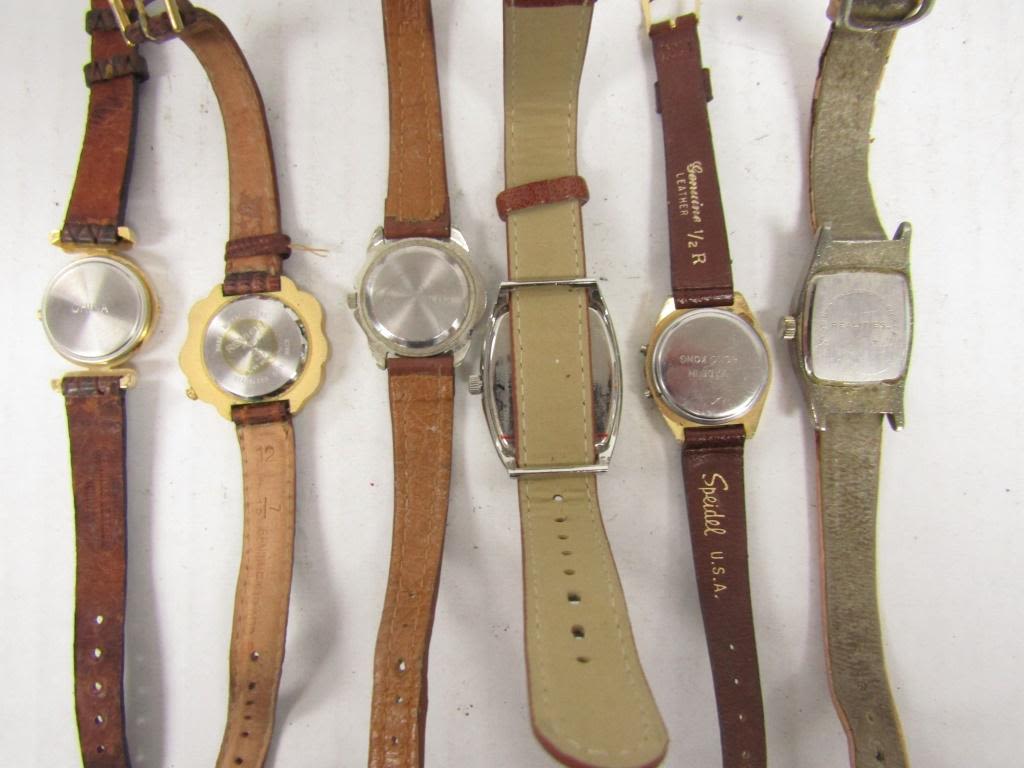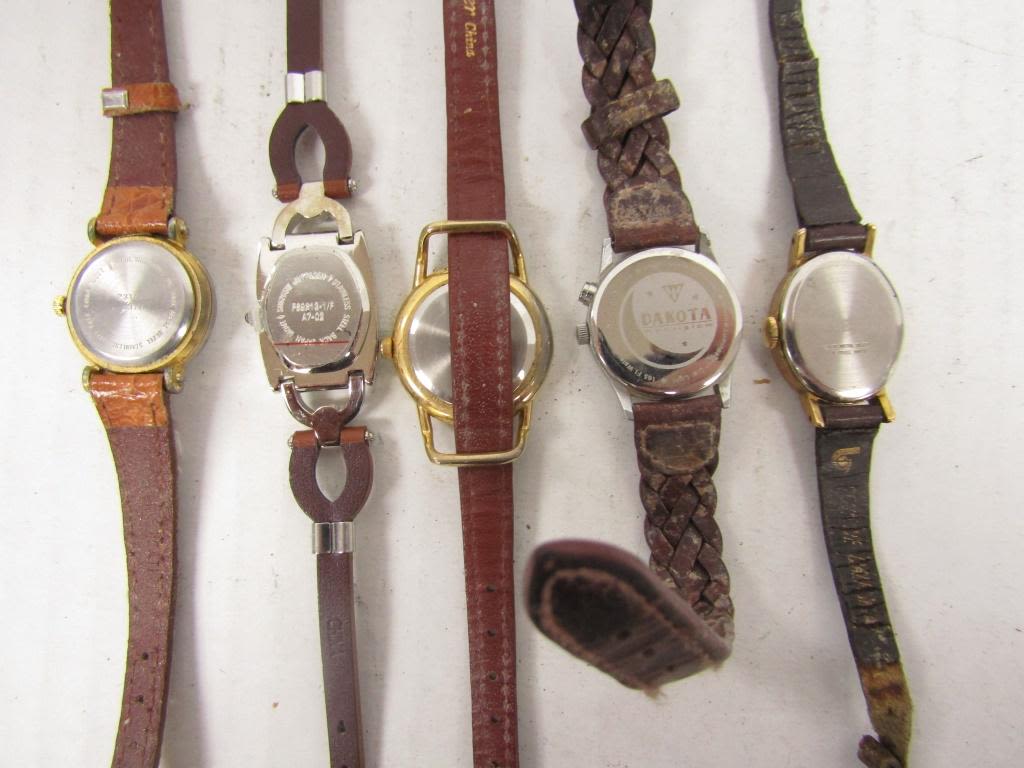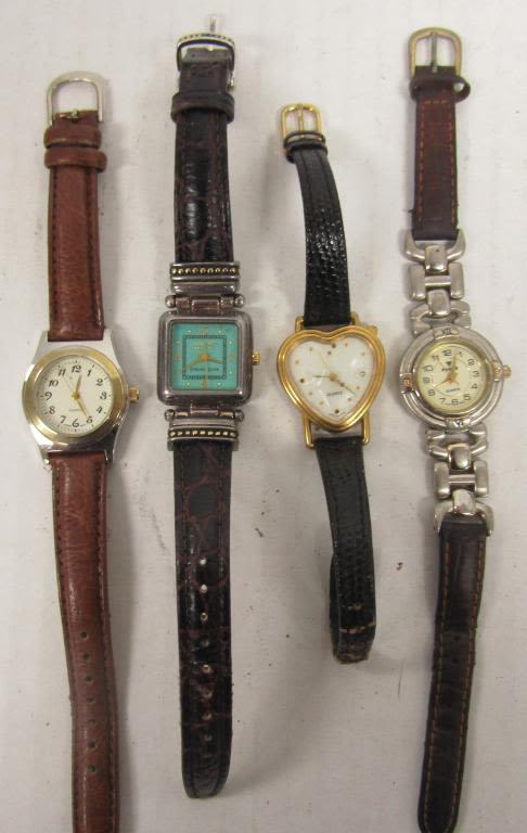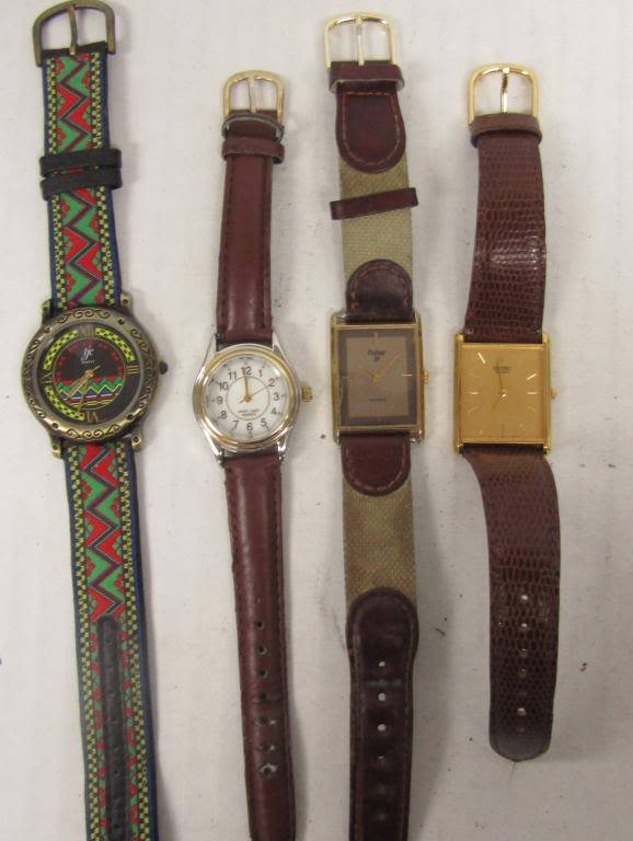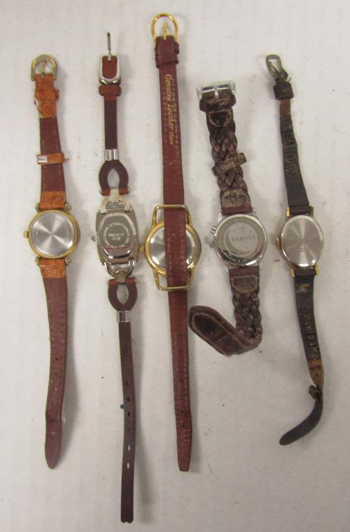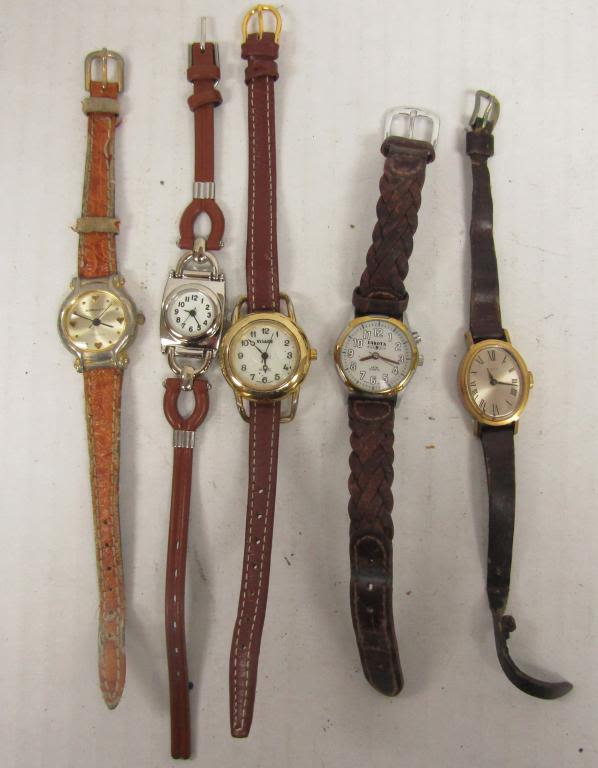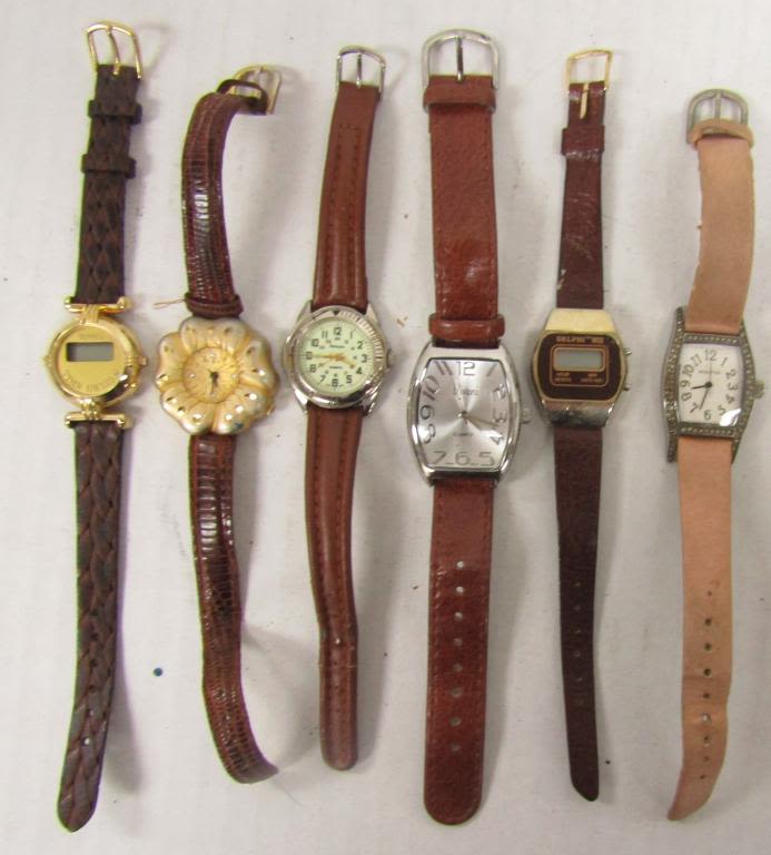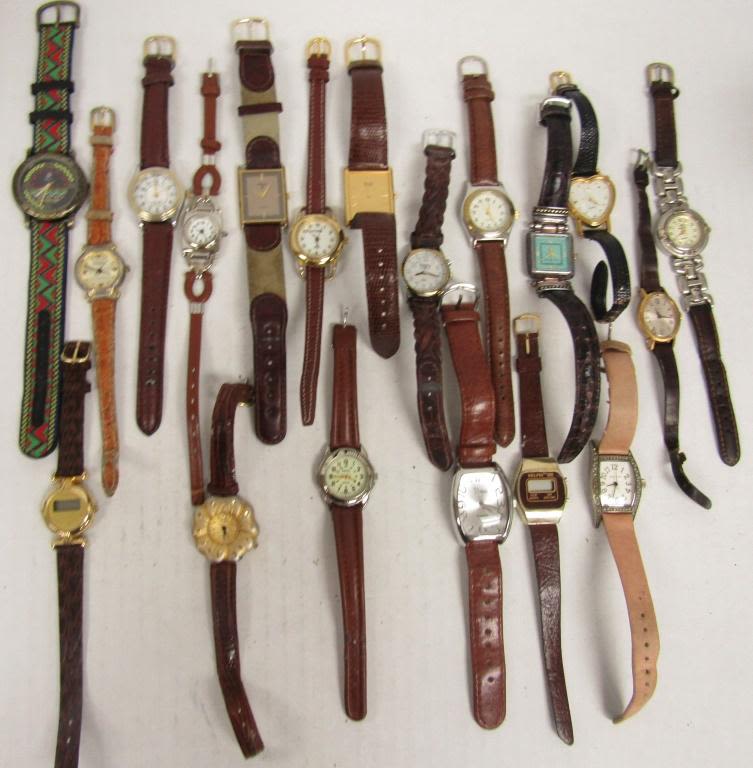 20 LADIES QUARTZ WATCHES-NOT TESTED AS TO WORKING OR NOT-SOME FOR PARTS OR REPAIR-SOME MAY WORK–LEATHER BANDS-REALITIES PULSAR, TIMEX, SEIKO, VISAGE, TJC, FOCUS, WHITE STAG, ECCLISSI, (2)WATCH IT, SARAH