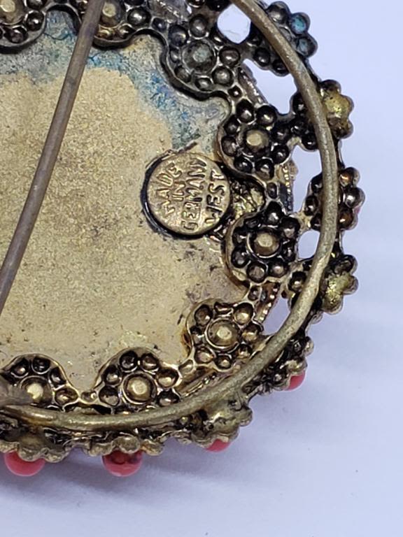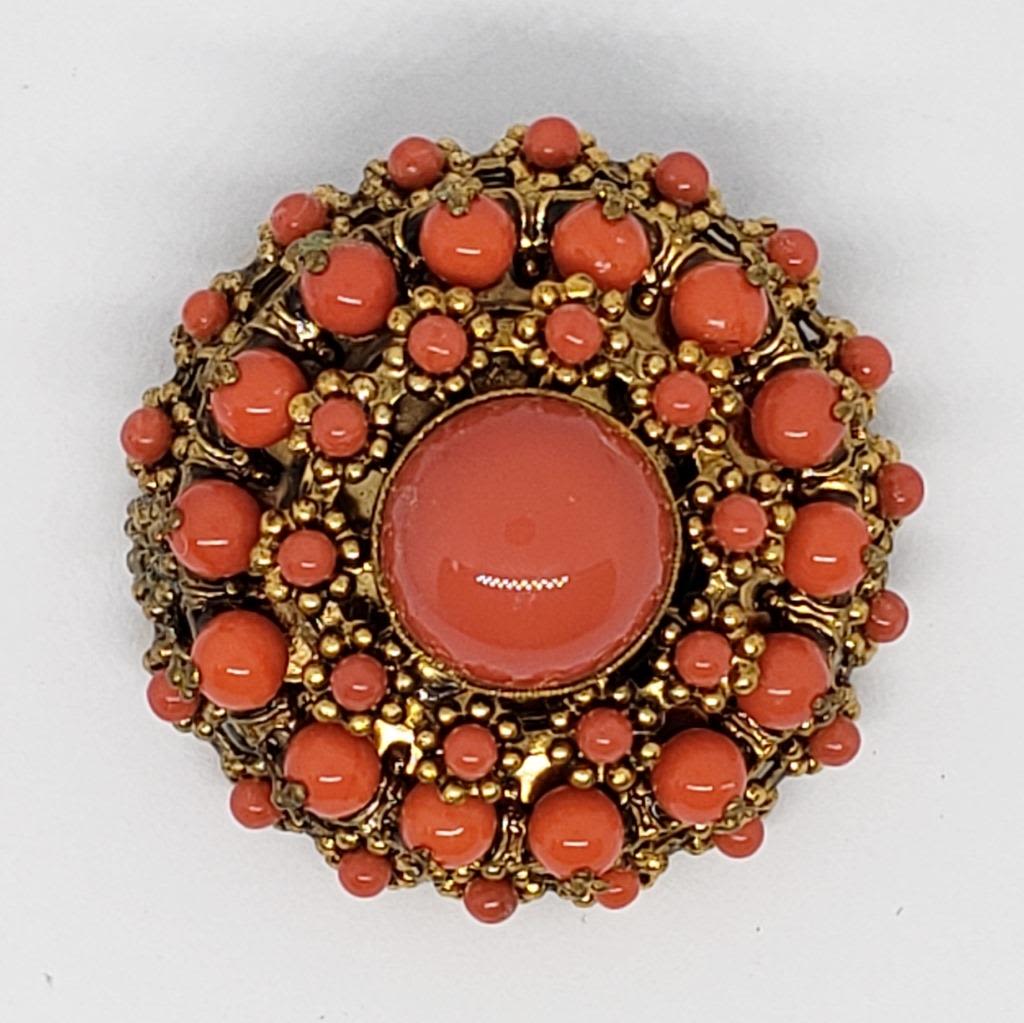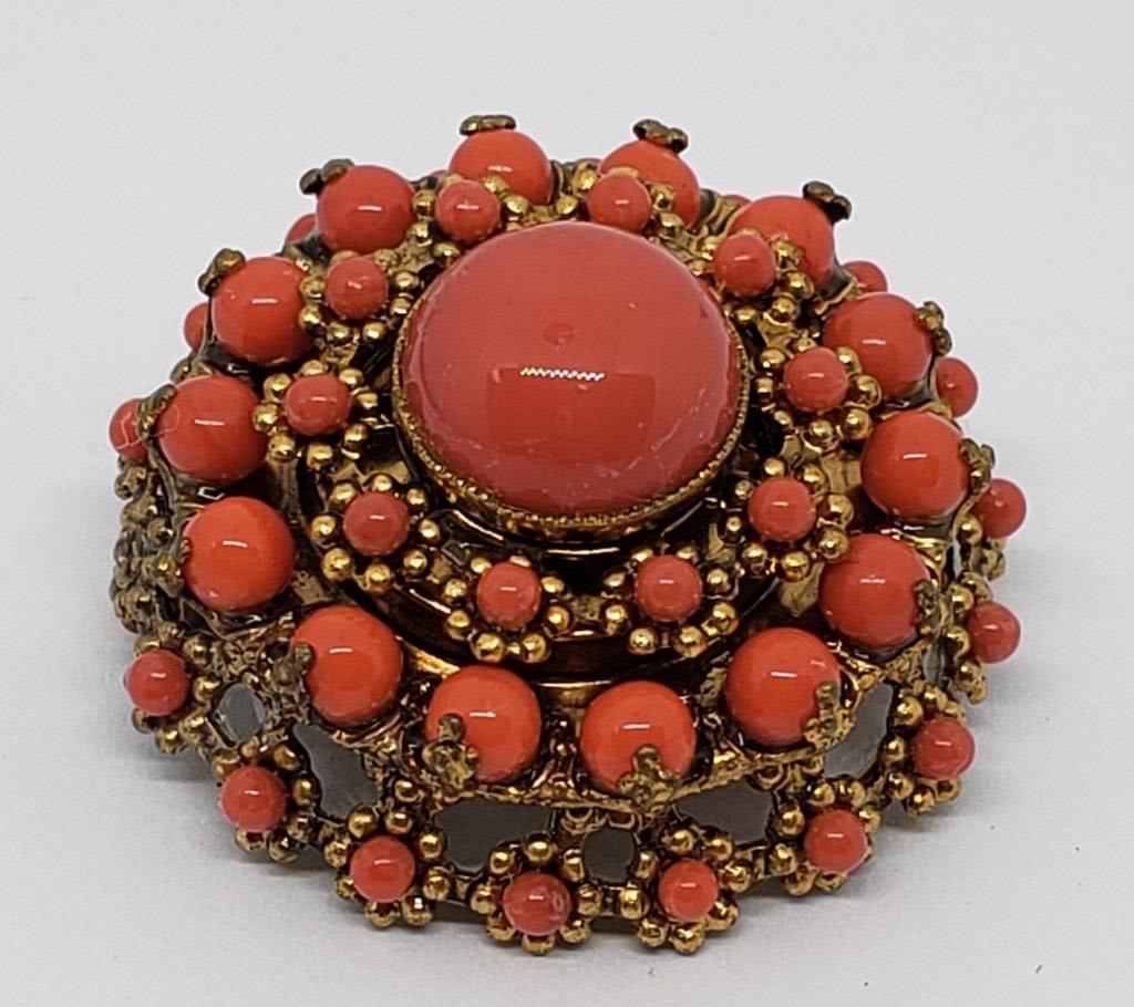 BROOCH WITH CORAL LUCITE ACCENTS (1)BEAD IS MISSING