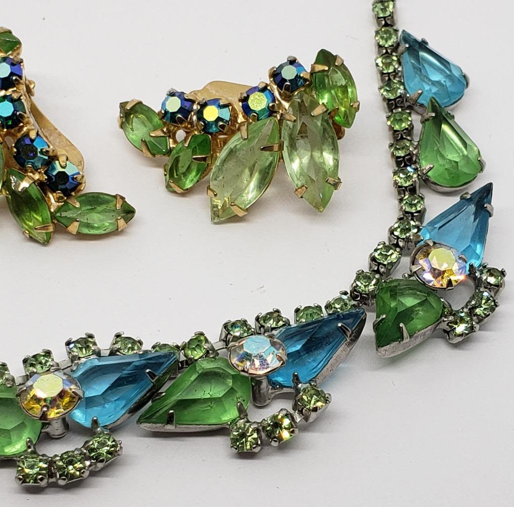 GREEN RHINESTONE FLOWER NECKLACE PLUS (1)PAIR OF GOLD TONED BABY BLUE AND ELECTRIC GREEN CLIP ON EARRINGS
