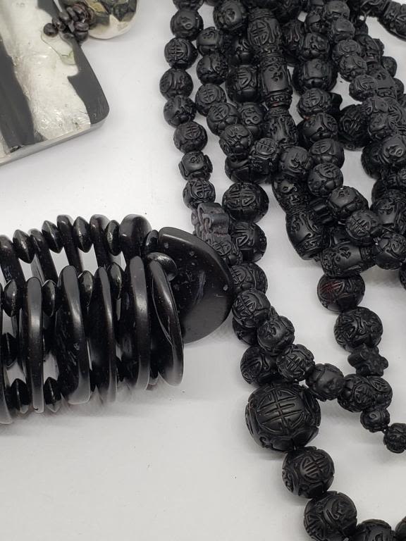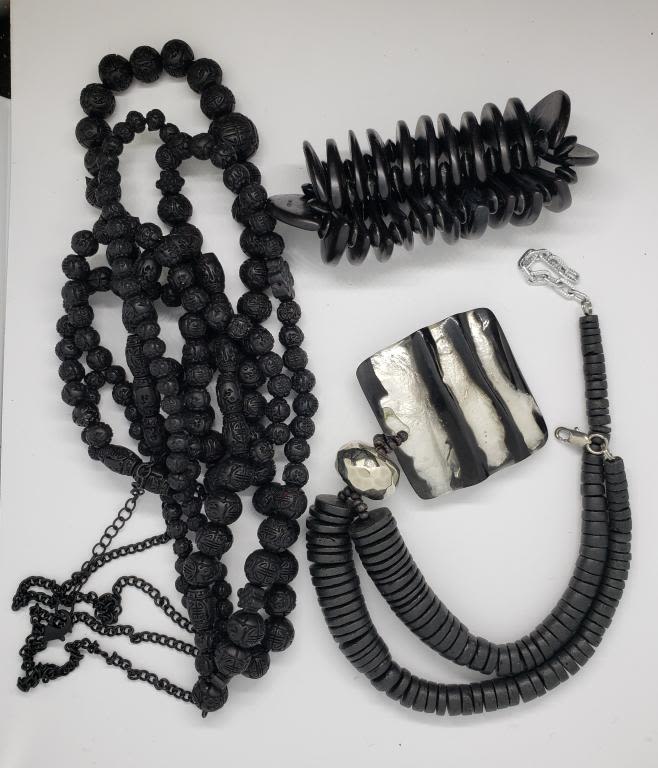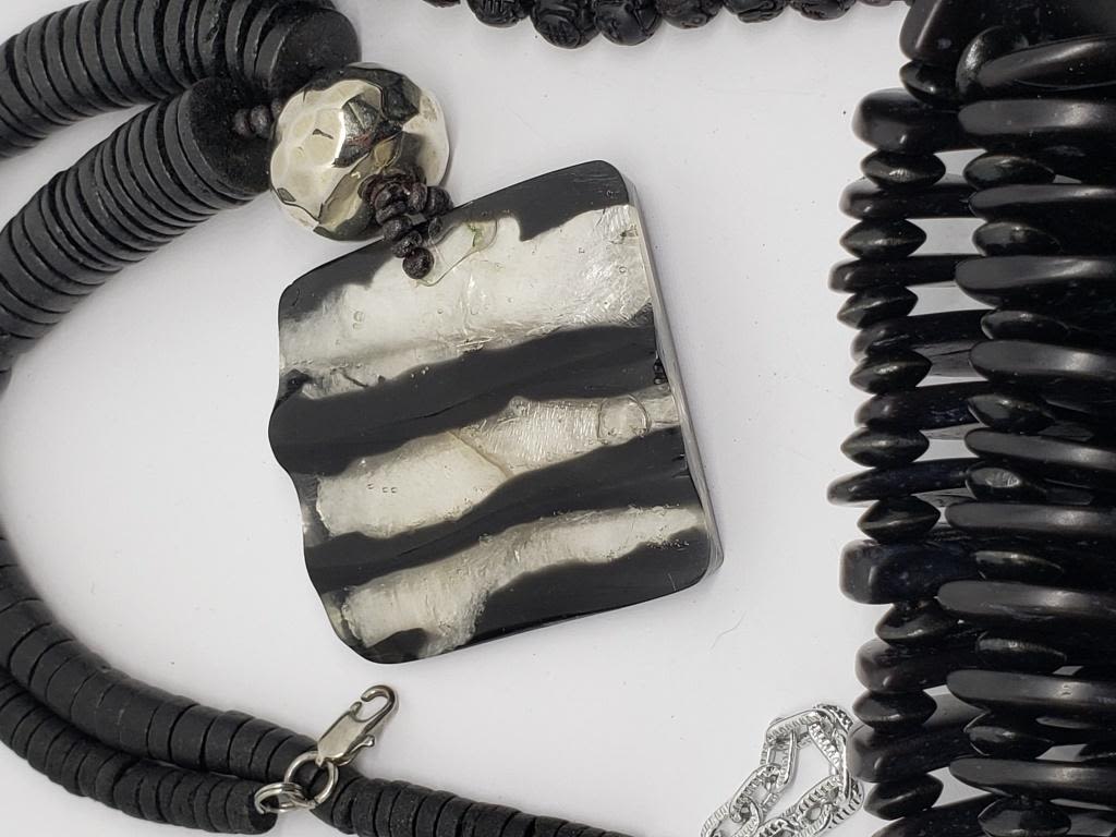 LUCITE (!)WITH LARGE BLACK AND WHITE LUCITE PENDAT PLUS BLACK CHUCKY STRETCHY BRACELET