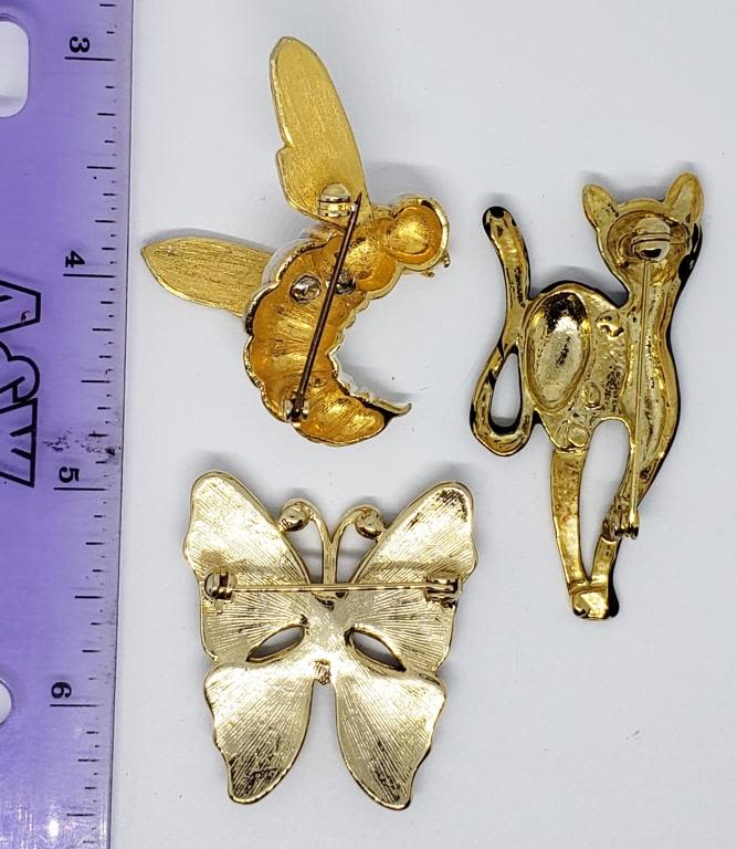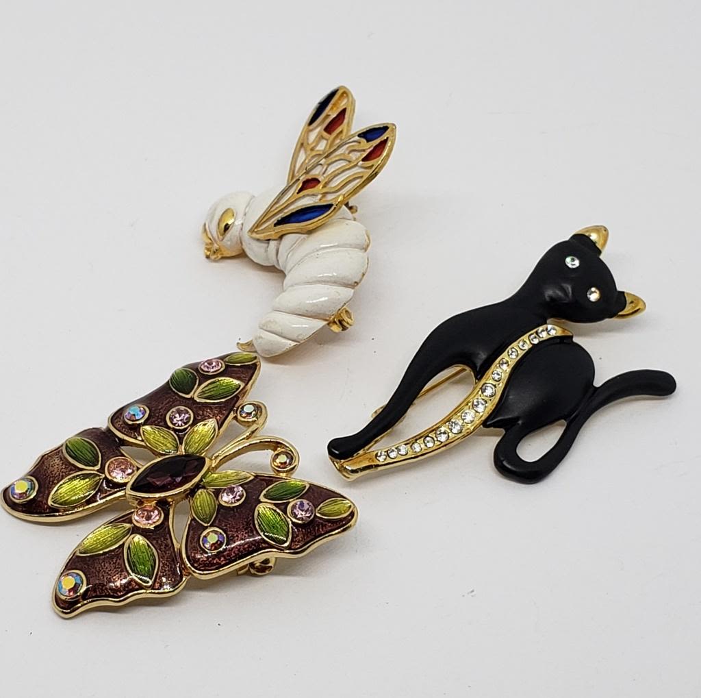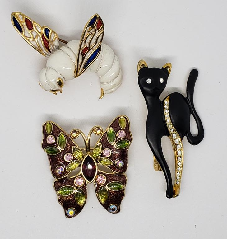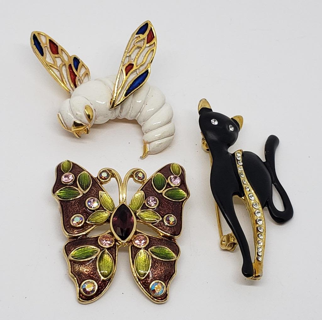 (1)WASP WITH RED WHITE AND BLUE ENAMEL (1)BUTTERFLY WITH ENAMEL AND RHIENSTONES (1)CAT WITH ENAMEL AND RHINESTONES
