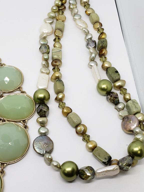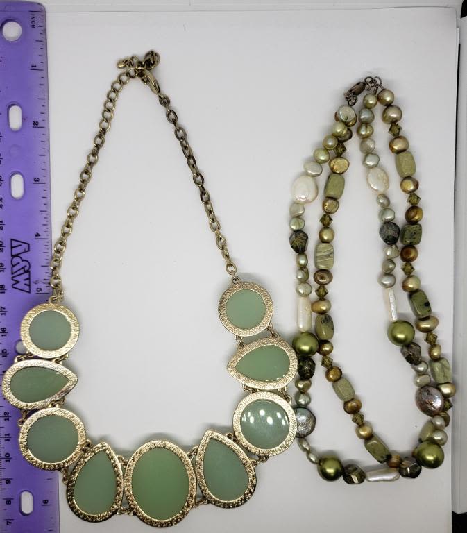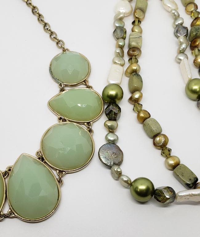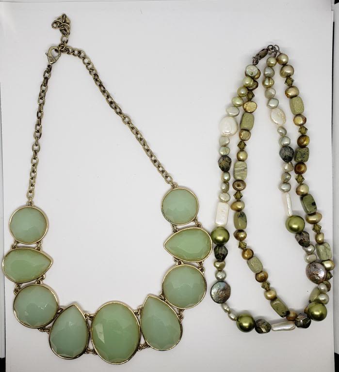 LUCITE PLUSE (1) DOUBLE STRANDED GREEN CULTURED PEARL AND ABILONE BEADED NECKLACE