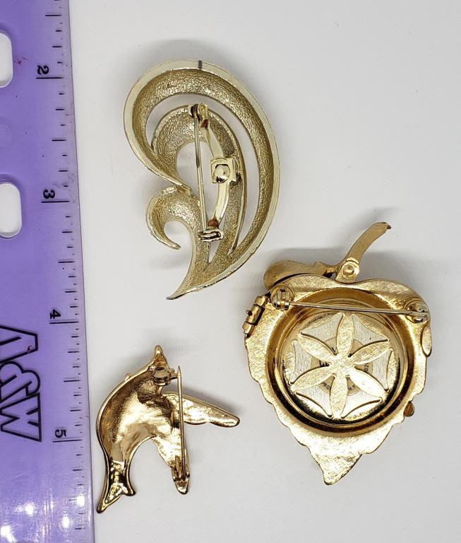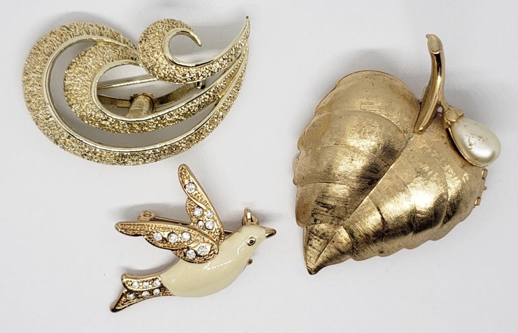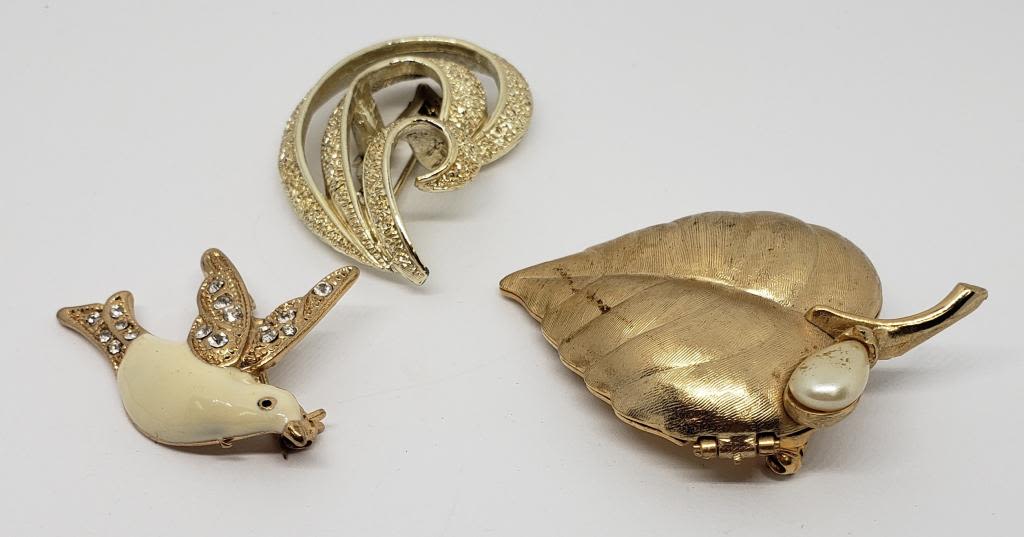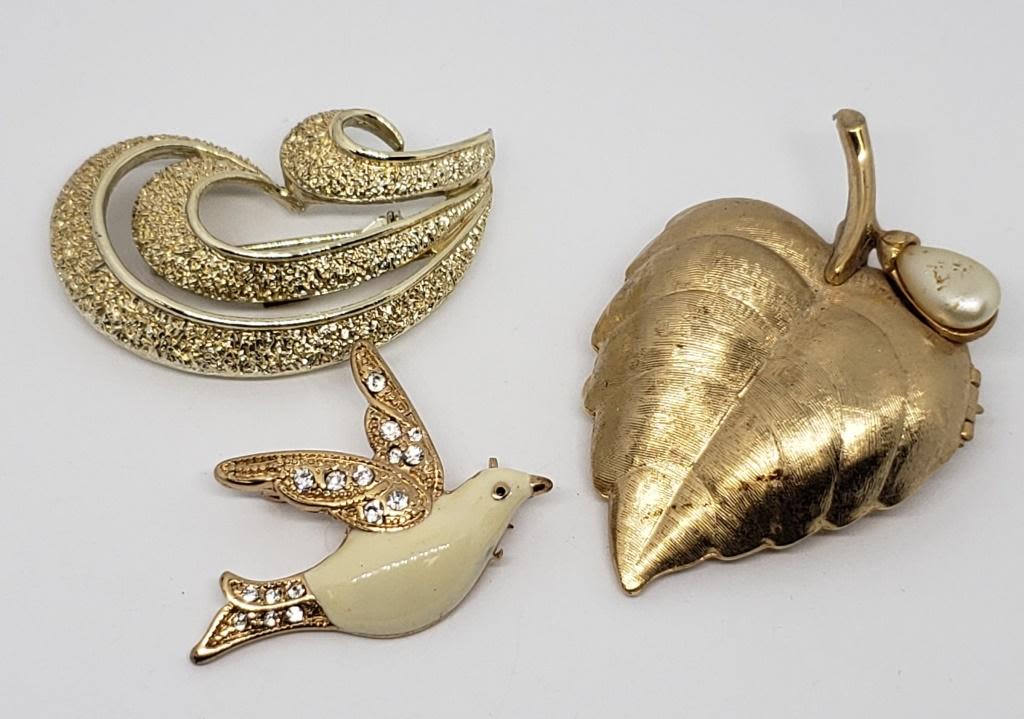 WITH FAUX PEARL PLUSE (2)GOLD TONED BROOCHES (1)DOVE WITH ENAMEL AND RHINESTONES