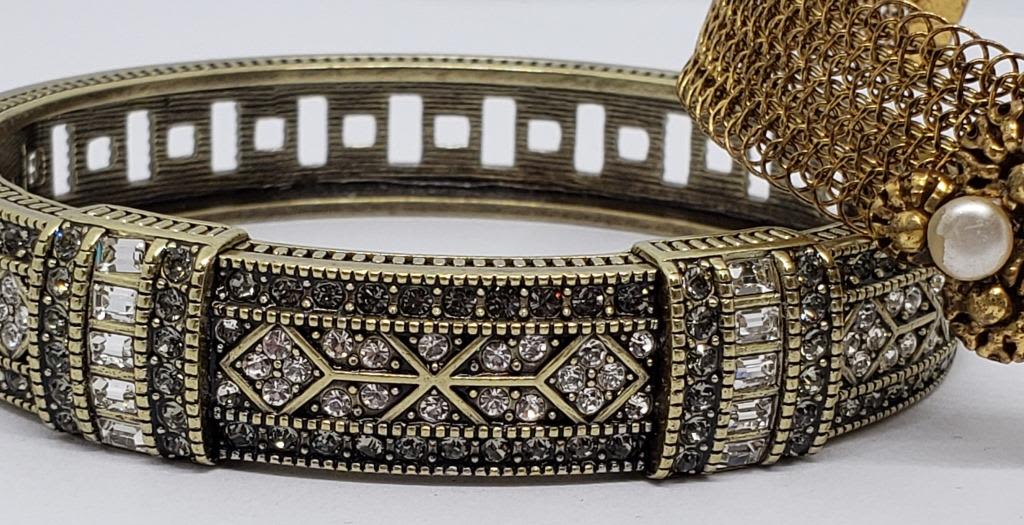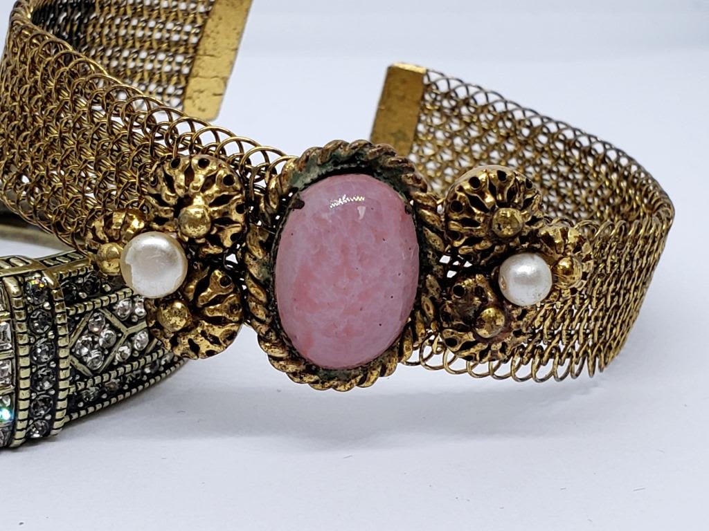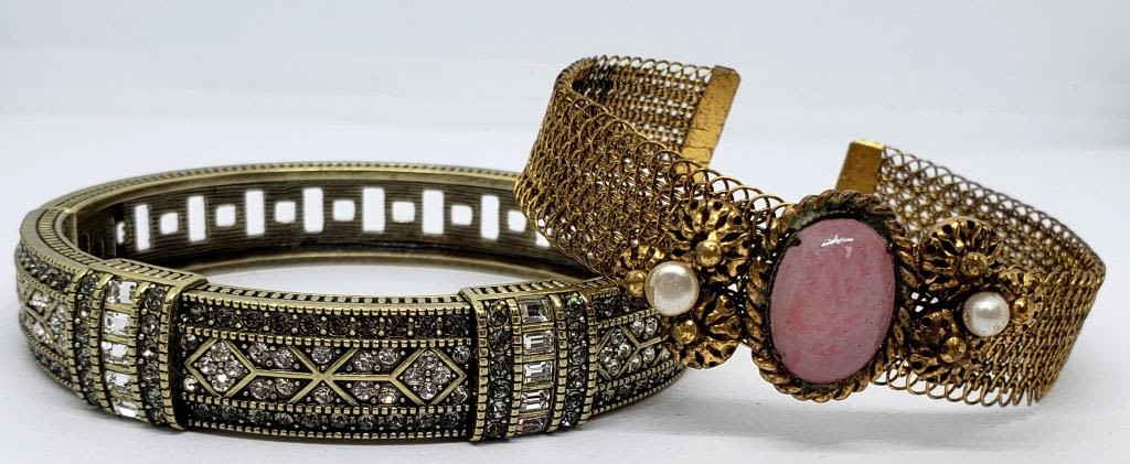 FAUX PEARL AND PINK LUCITE CENTER PLUS HEIDI DAUS GOLD TONED HINGED BANGLE WITH RHINESTONE ACCENTS