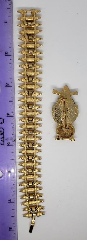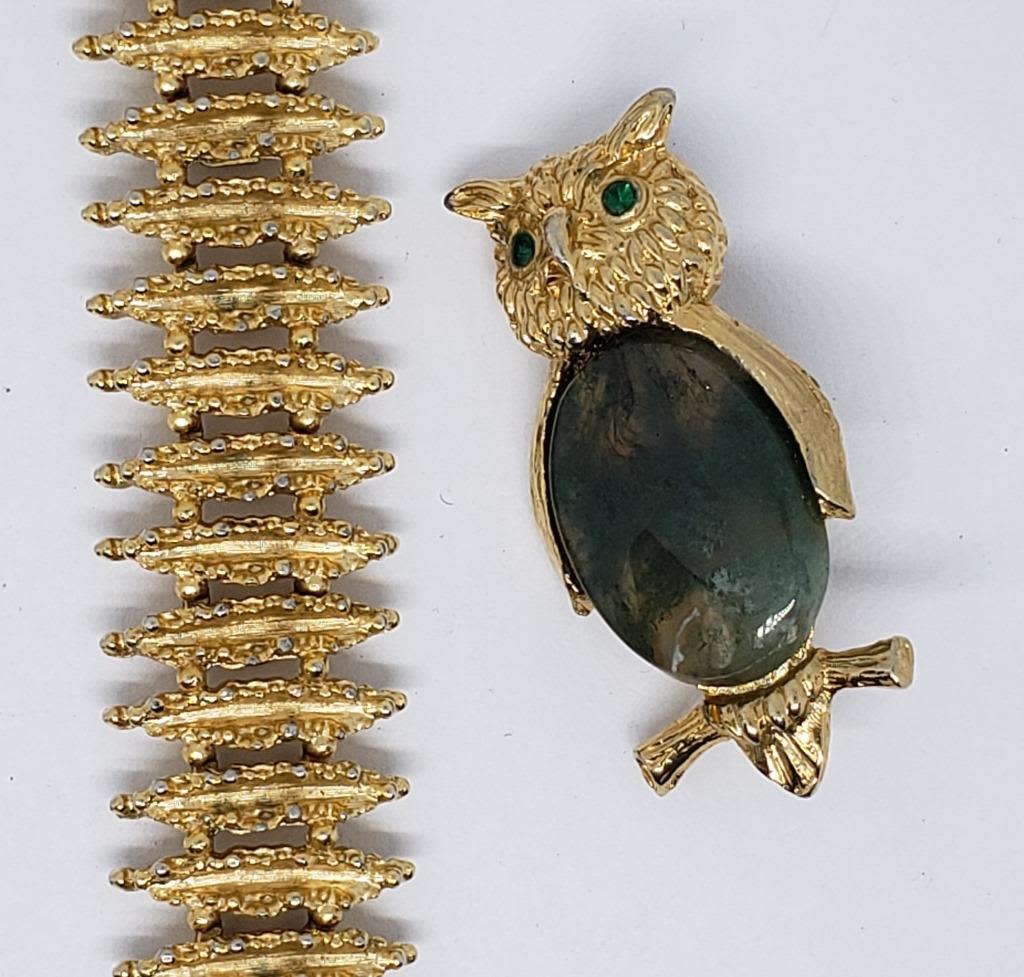 PLUS GOLD TONED OWL BROOCH WITH RHINESTONE EYES AND GREEN MARBLE LUCITE CENTER