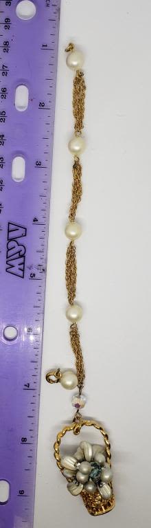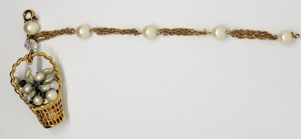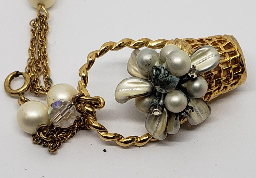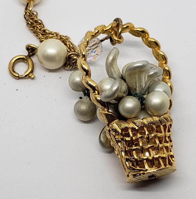 BASKET CHARM-LUCITE-RHINESTONES-OFF WHITE BEADS-DOUBLE STRANDED-BEAUTIFUL VINTAGE PIECE!!