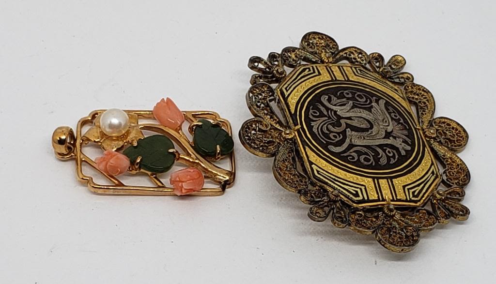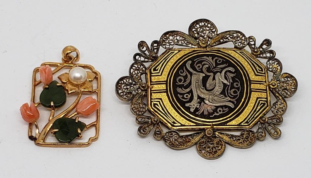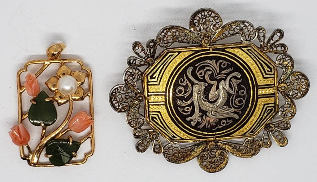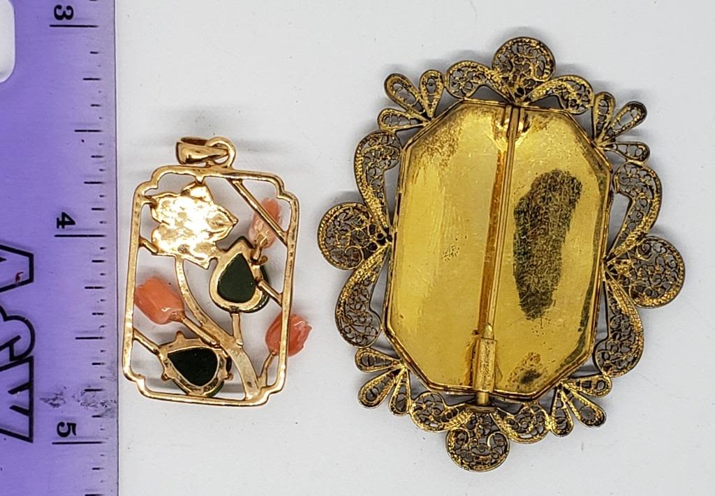 FILIGREE BORDER PLUSE GOLD TONED FLOWER PENDANT WITH CARVED JADITE LEAVES CARVED CORAL PETALS AND FAUX PEARL ACCENT