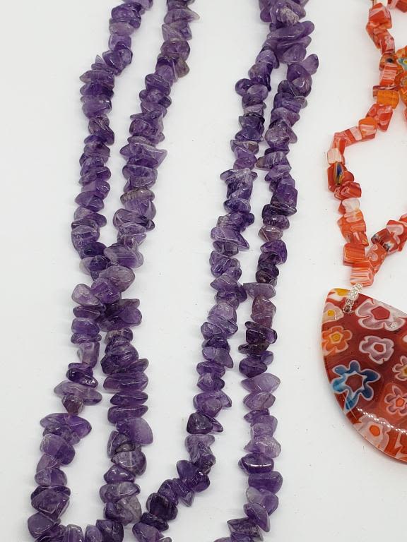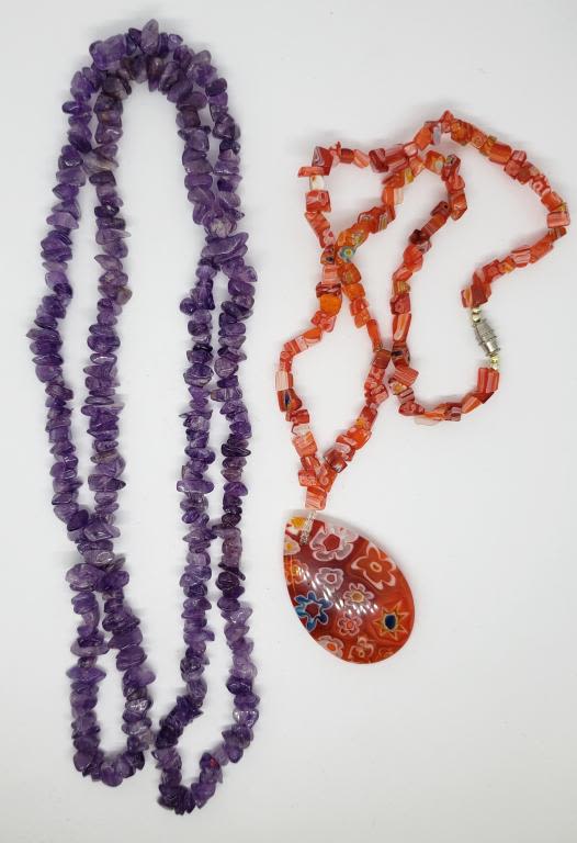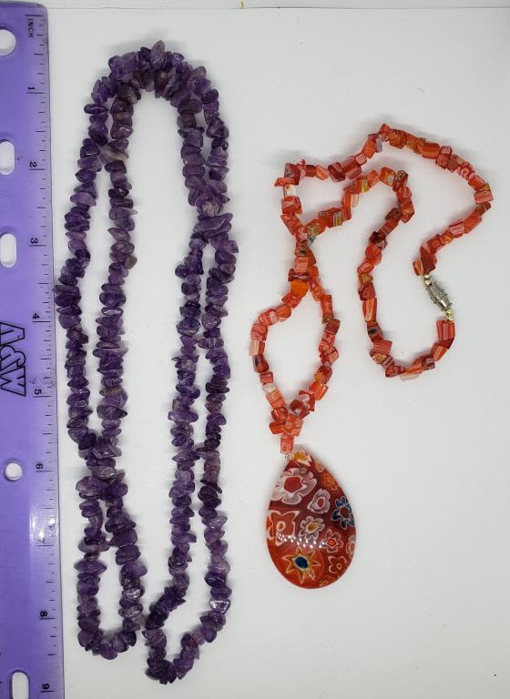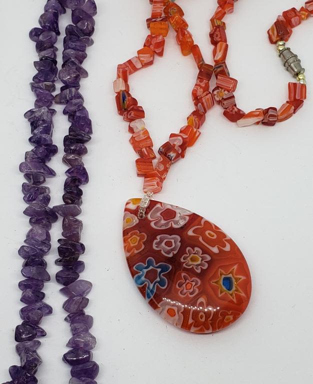 RED CHIPED GLASS NECKLACE WITH RED GLASS TEAR DROP PENDANT WITH FLOWER DESIGN