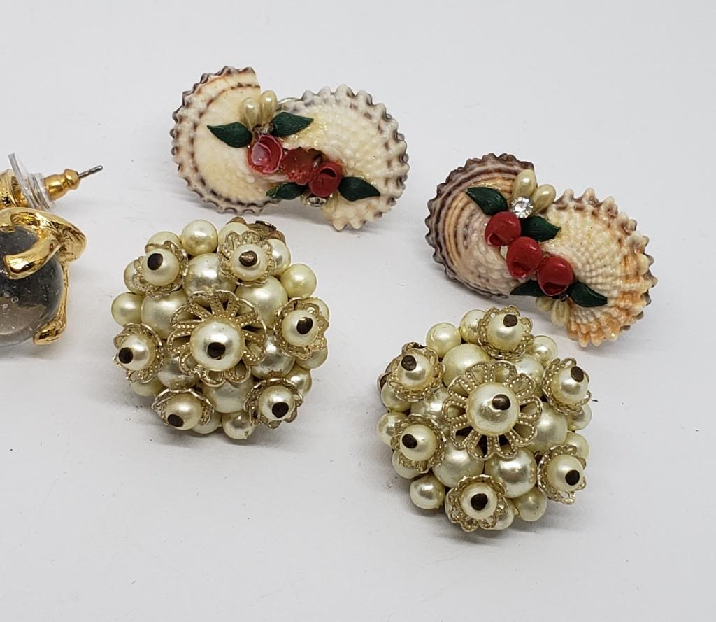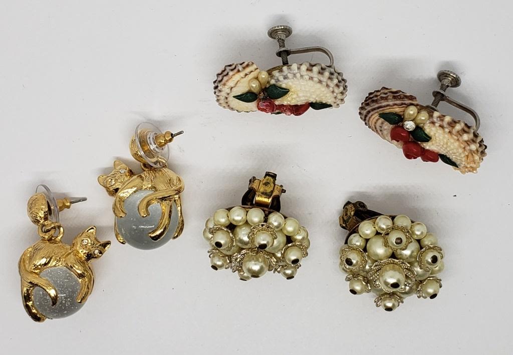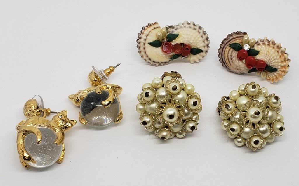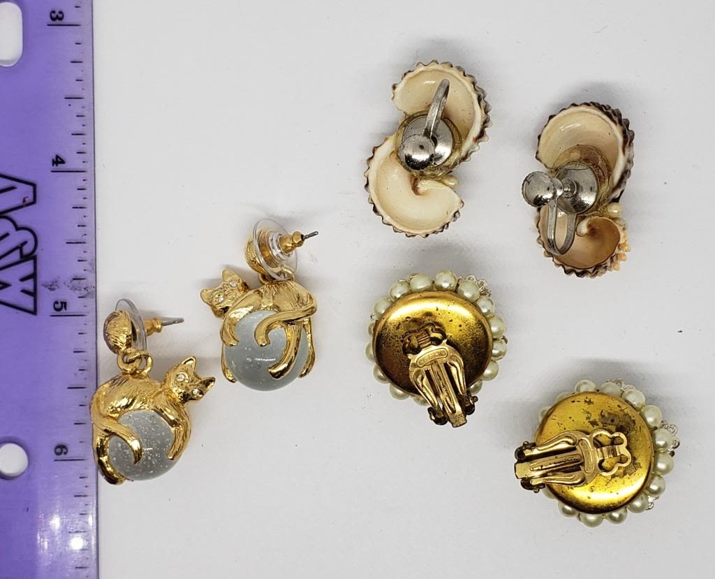 BACK (1)PIERCED-JAPAN FAUX PEARLS (1)SHELL TWIST BACK (1)GOLD TONED CAT WITH LUCITE BALL