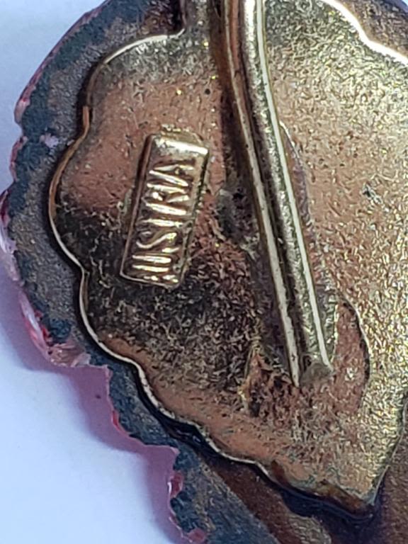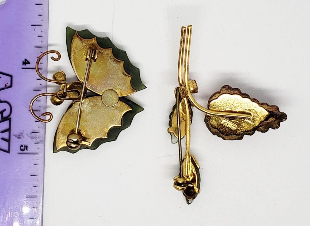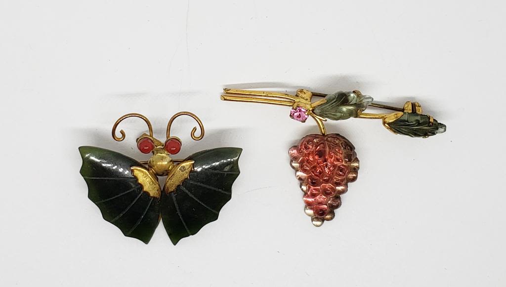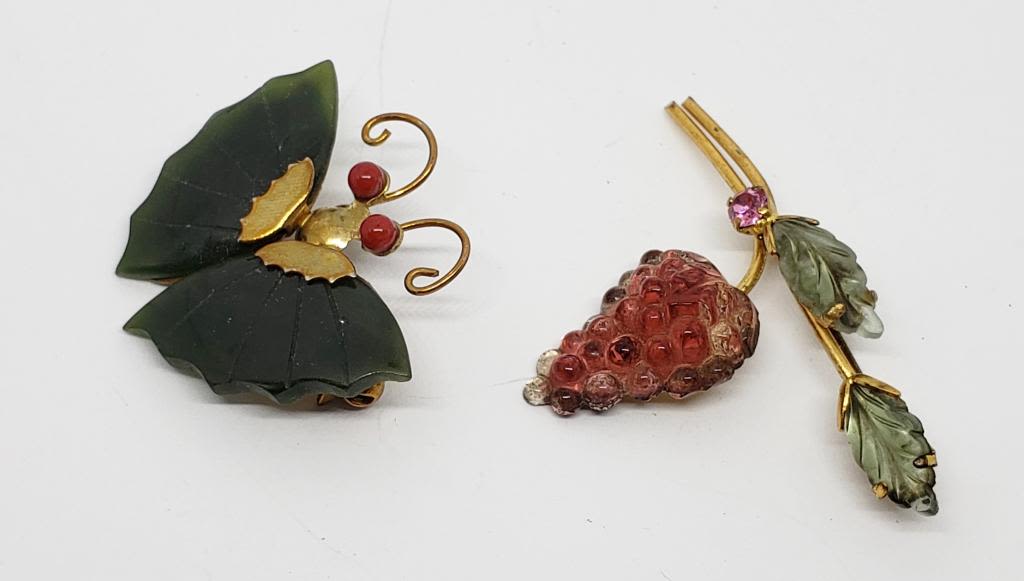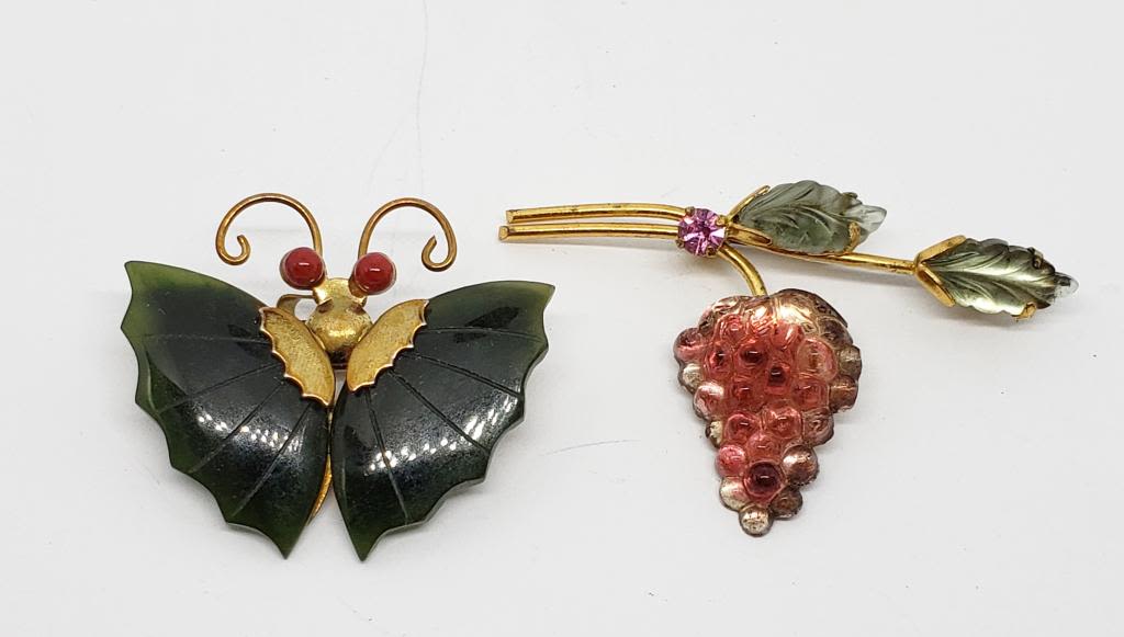 WITH JADITE WINGS & (1)AUSTRIA MADE STRAWBERRY BROOCH WITH GREEN AND RED LUCITE-PINK RHINESTONE ACCENT