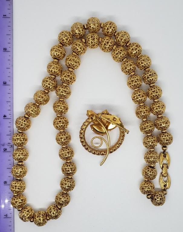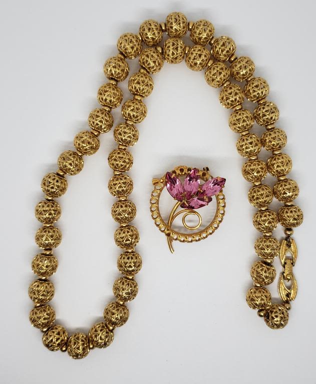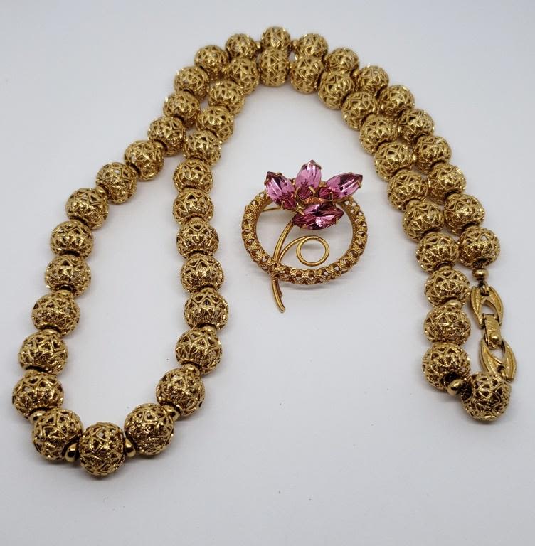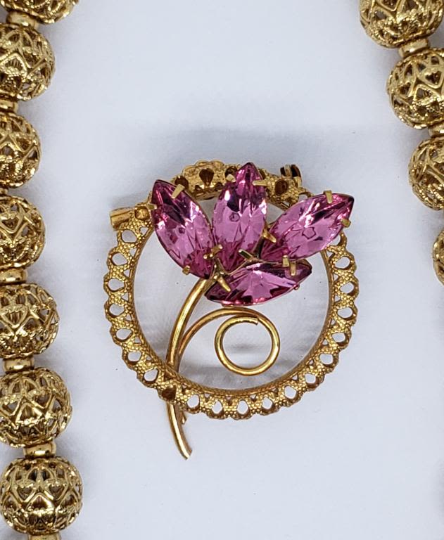 NECKLACE PLUS GOLD TONED CIRCULAR PINK RHINESTONE FLOWER BROOCH
