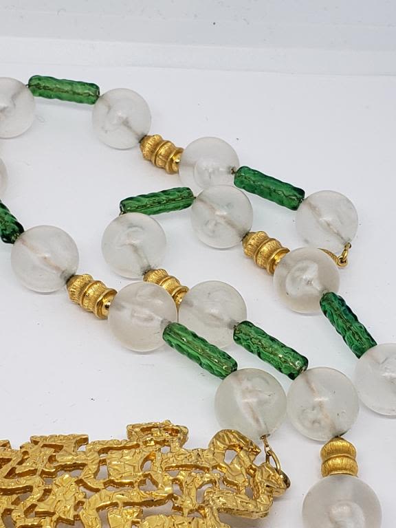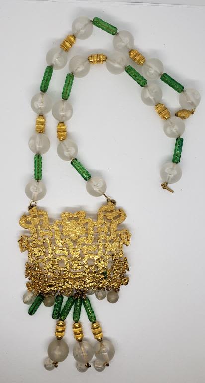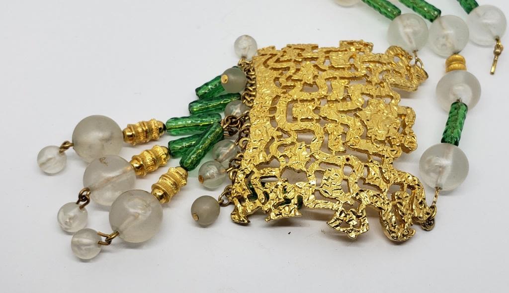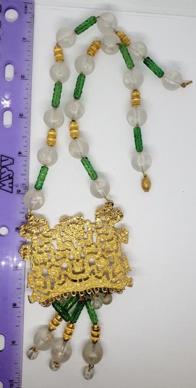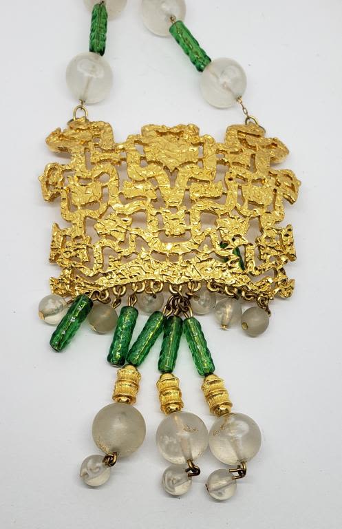 LARGE RECTANGLE PENDANT WITH CUT OUT DESIGN-DANGLY CHARMS-CLEAR BEADS-GREEN LUCITE BEAD ACCENTS