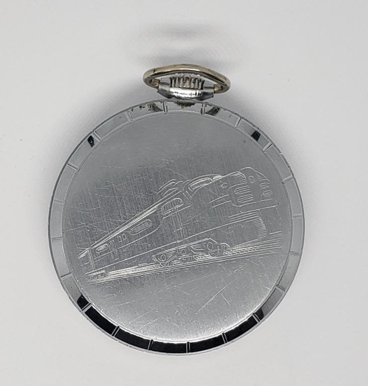 MONTGOMERY DIAL, 17 j, CHROME SNAP BACK CASE with TRAIN ENGRAVING – WORKING CONDITION