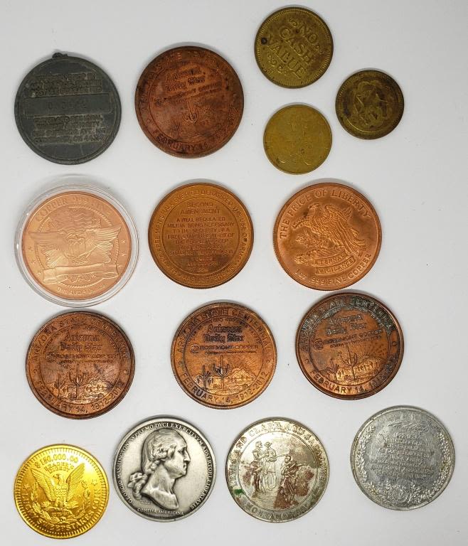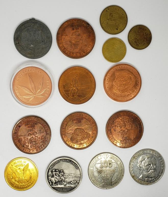 (4) ARIZON DAILY STAR, DON’T TREAD ON ME, RIGHTS TO BEAR ARMS, LEGALIZE CANNABIS plus 1964 MONTANA ROUND, AMERICANA ROUND, GRANT ROUND, RTA ROUND, (2) NO CASH VALUE TOKENS & ANGEL ROUND