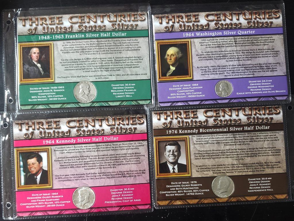 FRANKLIN HALF DOLLAR, 1964 KENNEDY SILVER HALF, 1964 WASHINGTON QTR, 1976 KENNEDY SILVER HALF DOLLAR