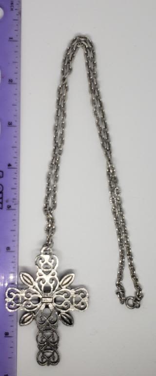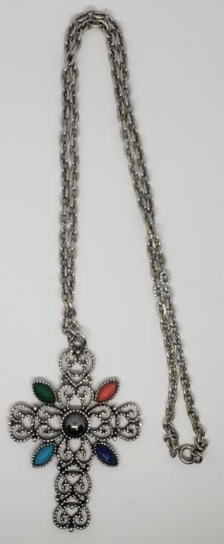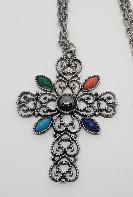 COLORED LUCITE ACCENTS-CROSS HAS CUT OUT DESIGNS-COMES WITH 24 INCH CIRCULAR LINKED CHAIN