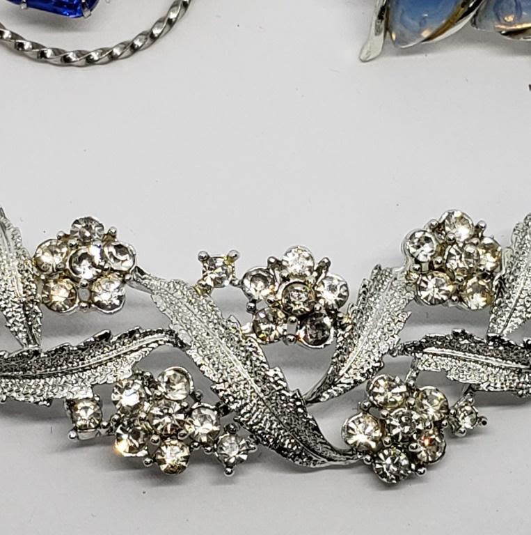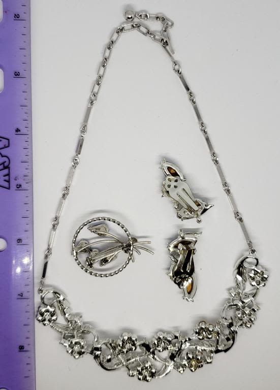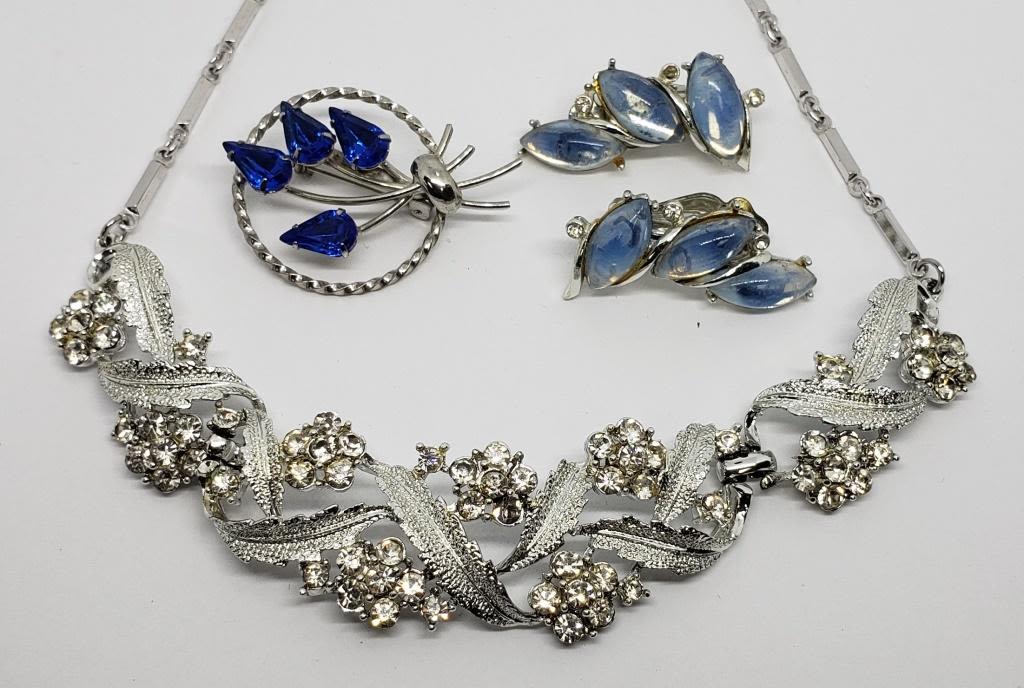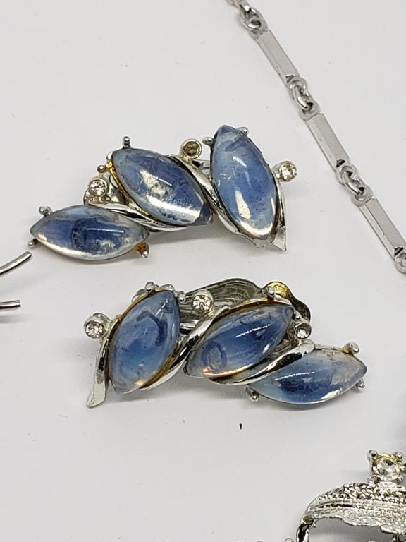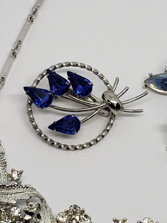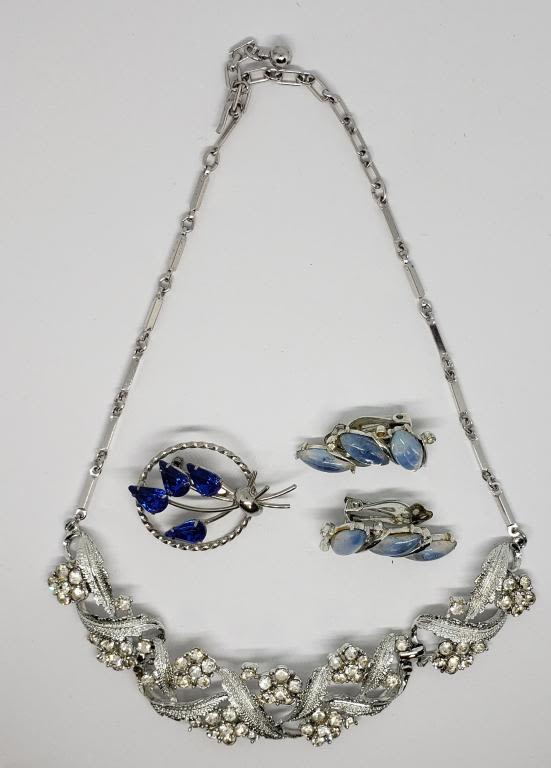 EARRINGS WITH BABY BLUE LUCITE (1)CIRCULAR BROOCH WITH NAVY RHINESTONES & (1)LEAF AND FLOWER RHINESTONE NECKLACE