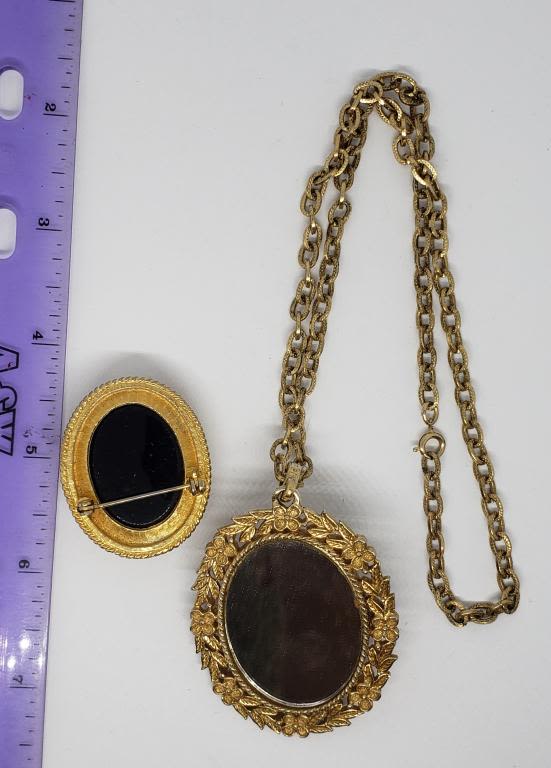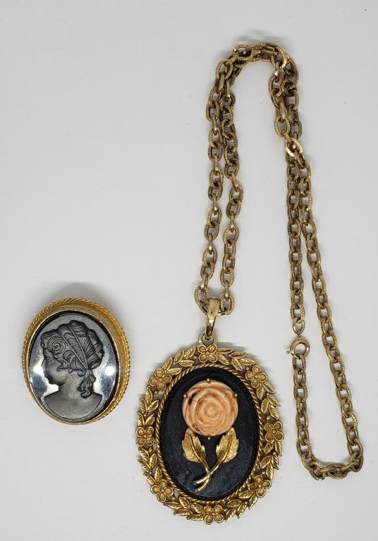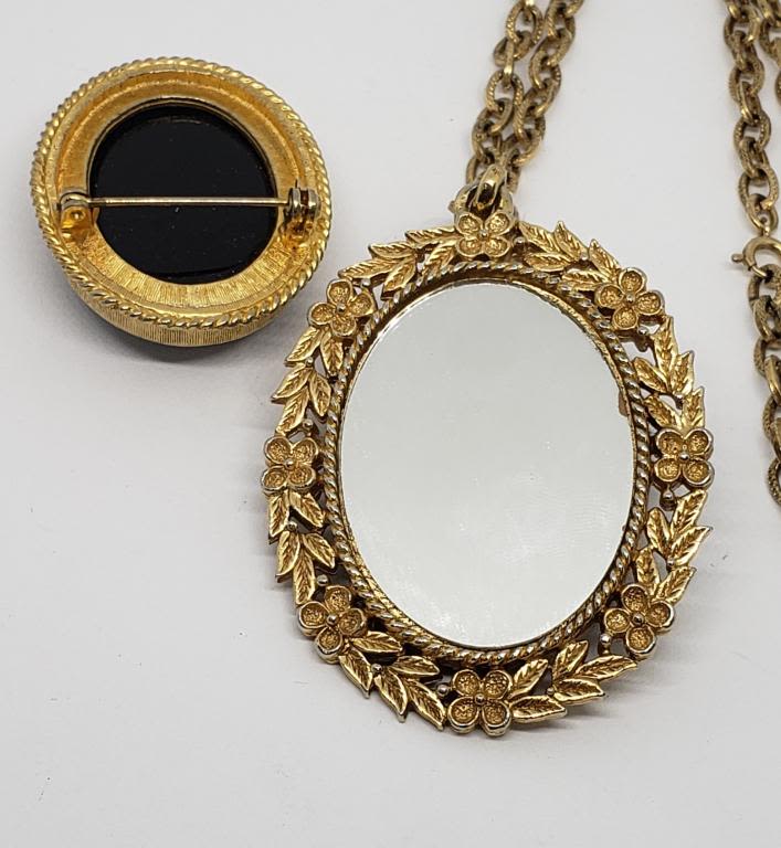 VTG GOLD TONED NECKLACE WITH PINK LUCITE ROSE PENDANT/MIRROR