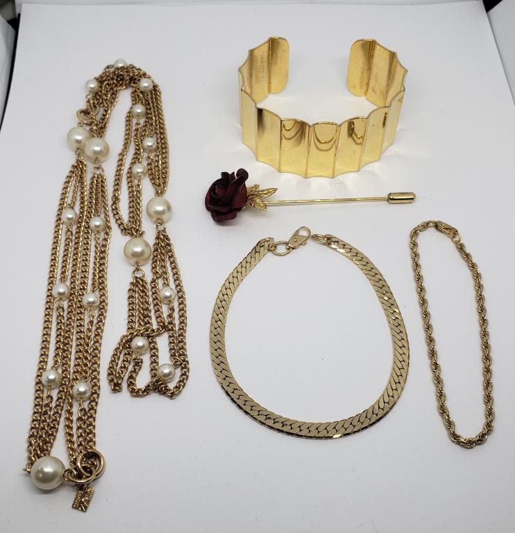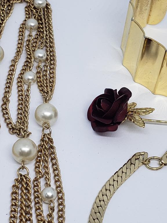 (1)METAL RED ROSE STICK PIN (2)BRACELET (1)EMMON MULTI STRANDED NECKLACE WITH FAUX PEARLS