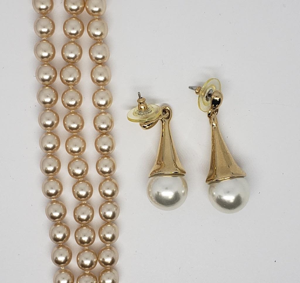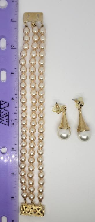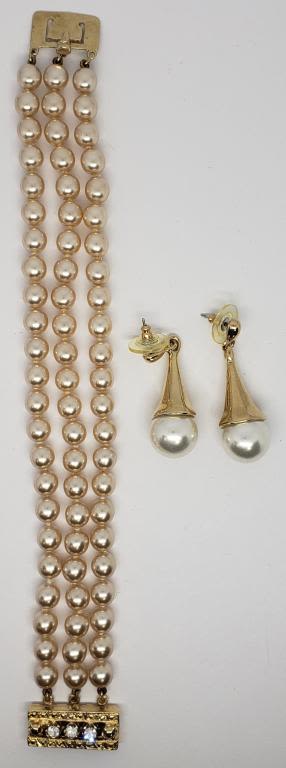BRACELET WITH RHINESTONE ENCLOSURE PLUSE (1)PAIR OF PIERCED DANGLY EARRNGS WITH WHITE LUCITE