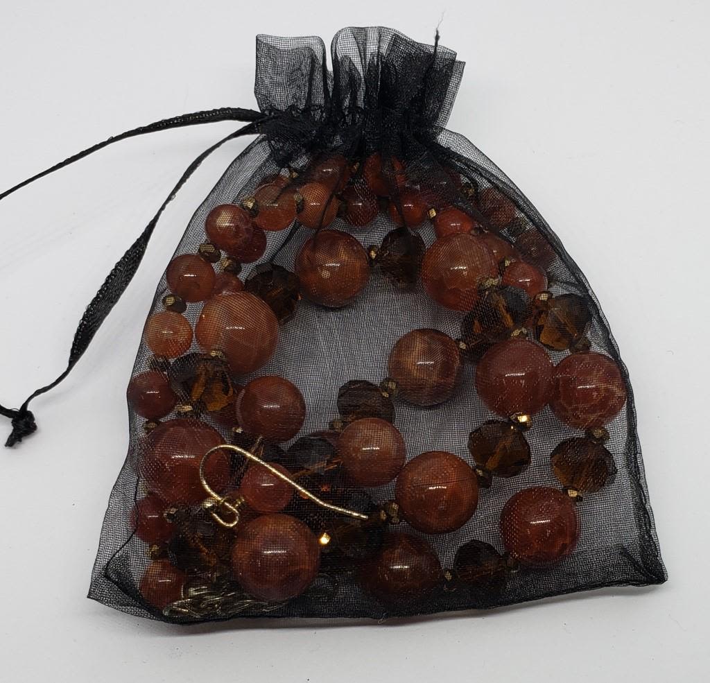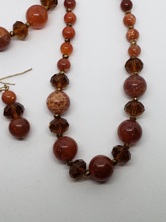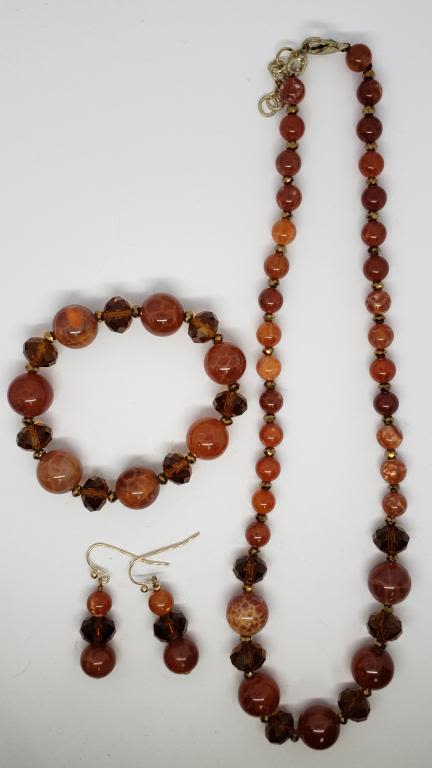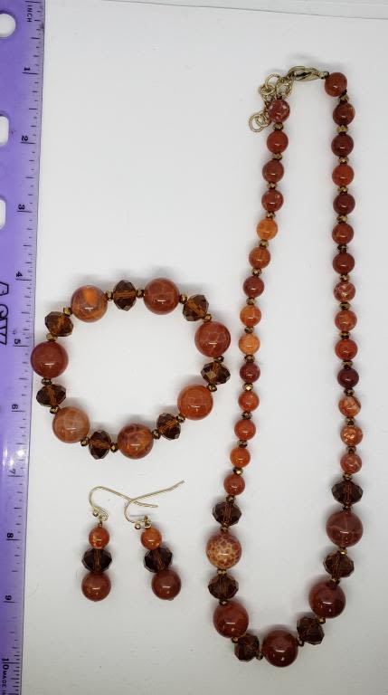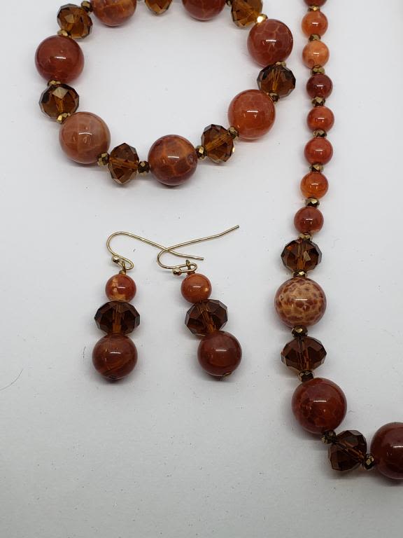 BEADED NECKLACE PLUS MATCHING BRACELET AND PAIR OF PIERCED DANGLY EARRINGS-BURNT RED COLOR-COMES WITH GIFT BAG