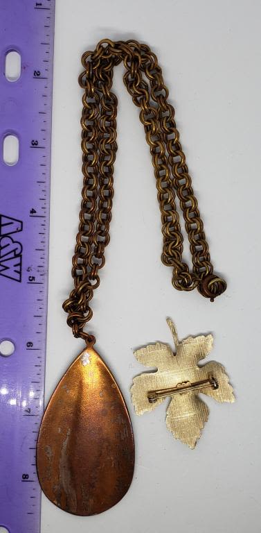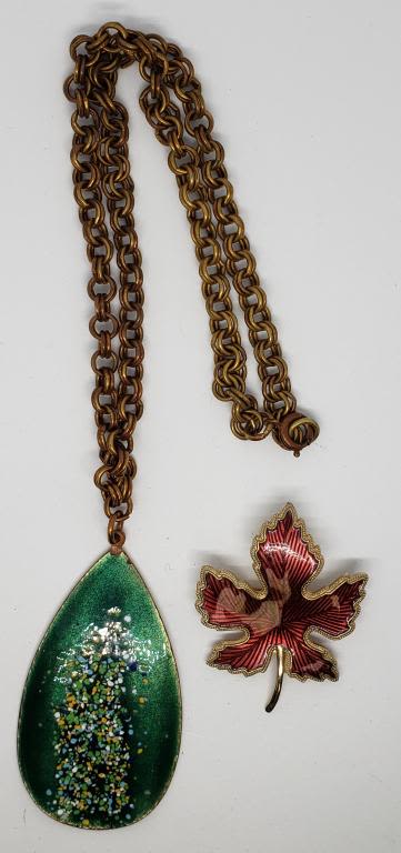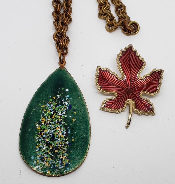 PENDANT PLUS (1)GOLD TONED LEAF BROOCH WITH RED ENAMEL