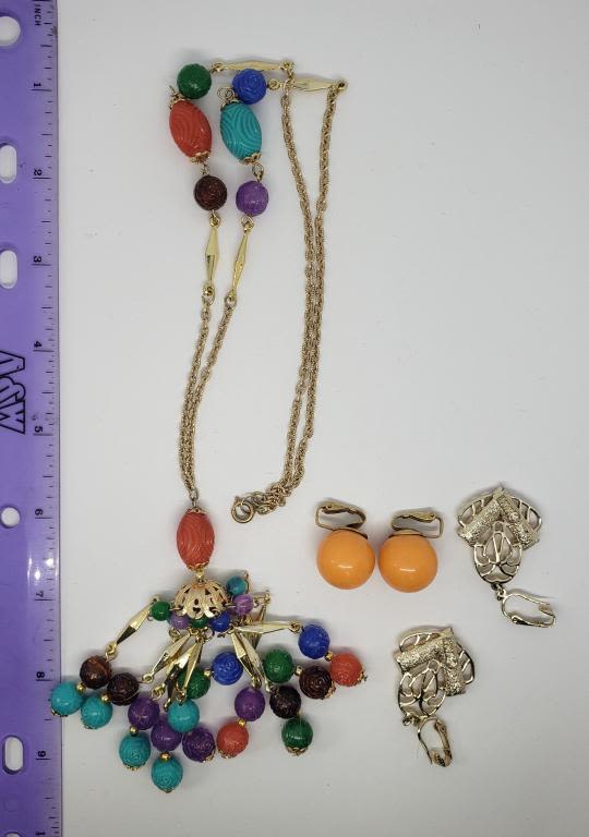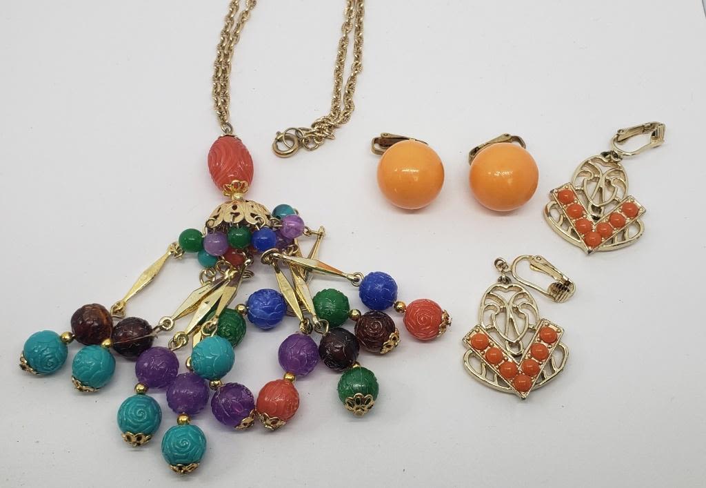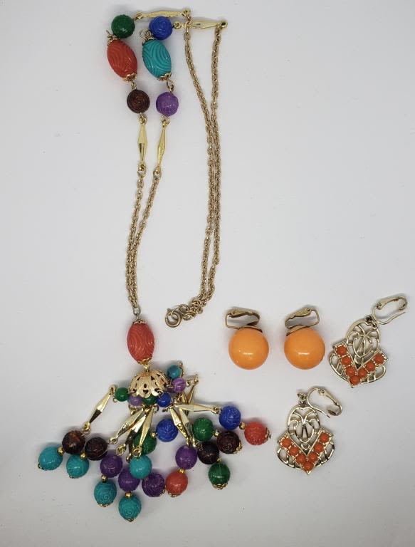 TASSLE PENDANT PLUS (2)PAIR OF CLIP ON EARRINGS WITH ORANGE LUCITE ACCENTS