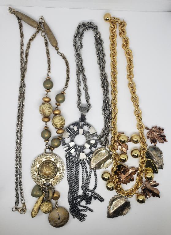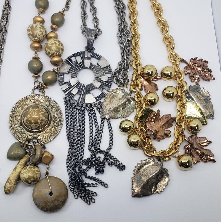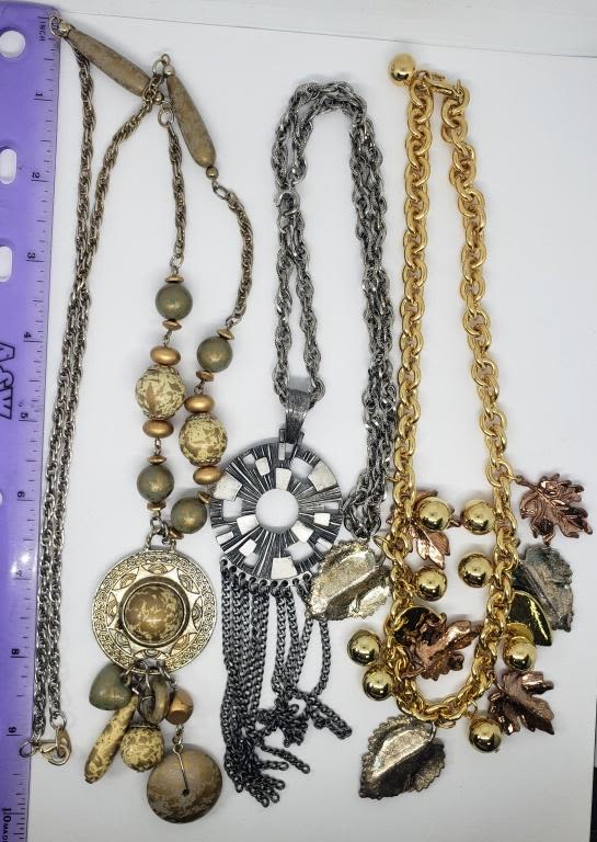 LEAF CHARMS (1)GOLD TONED WITH EARTH GREEN TONED BEADS (1)SILVER TONED LINKED CHAIN WITH CIRCULAR PENDANT WITH TASSLES