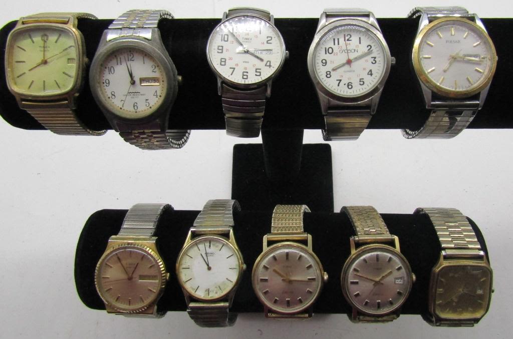ALL UNTESTED: SOME MAY WORK-SOME MAY NOT-SOME MAY NEED BATTERIES-SOME FOR PARTS OR REPAIRS-10 MENS QUARTZ WATCHES-SEIKO-PULSAR-(5)TIMEX-MISC