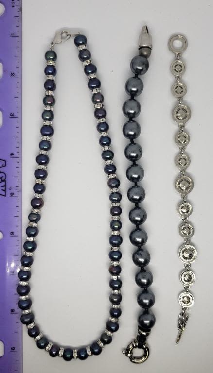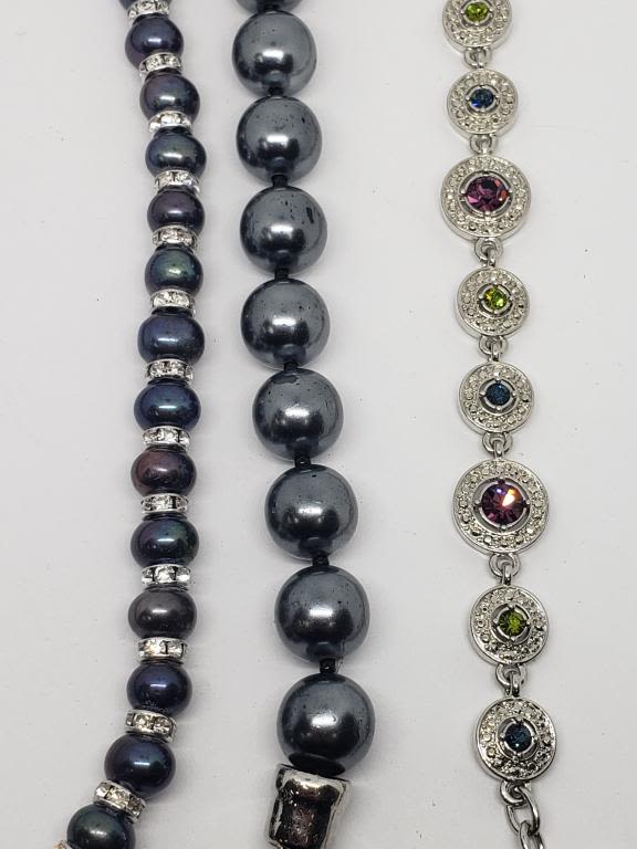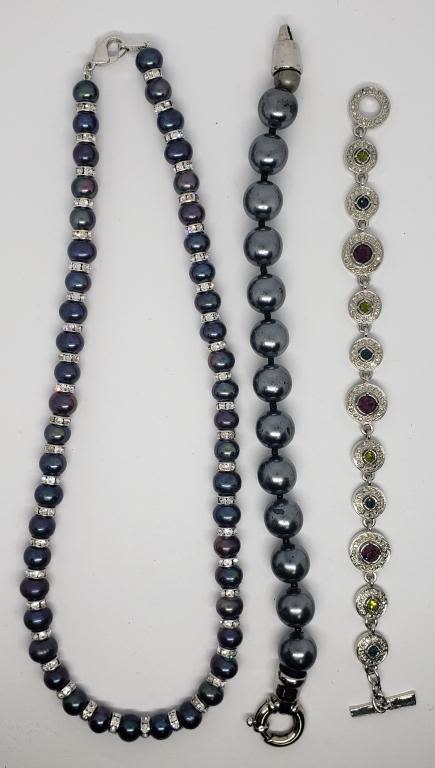 TENNIS BRACELET WITH PURPLE GREEN AND BLUE RHINESTONES (1)BLUE BEADED NECKLACE WITH RHINESTONE ACCENTS & (1)CHUNKY BLUE BEADED BRACELET