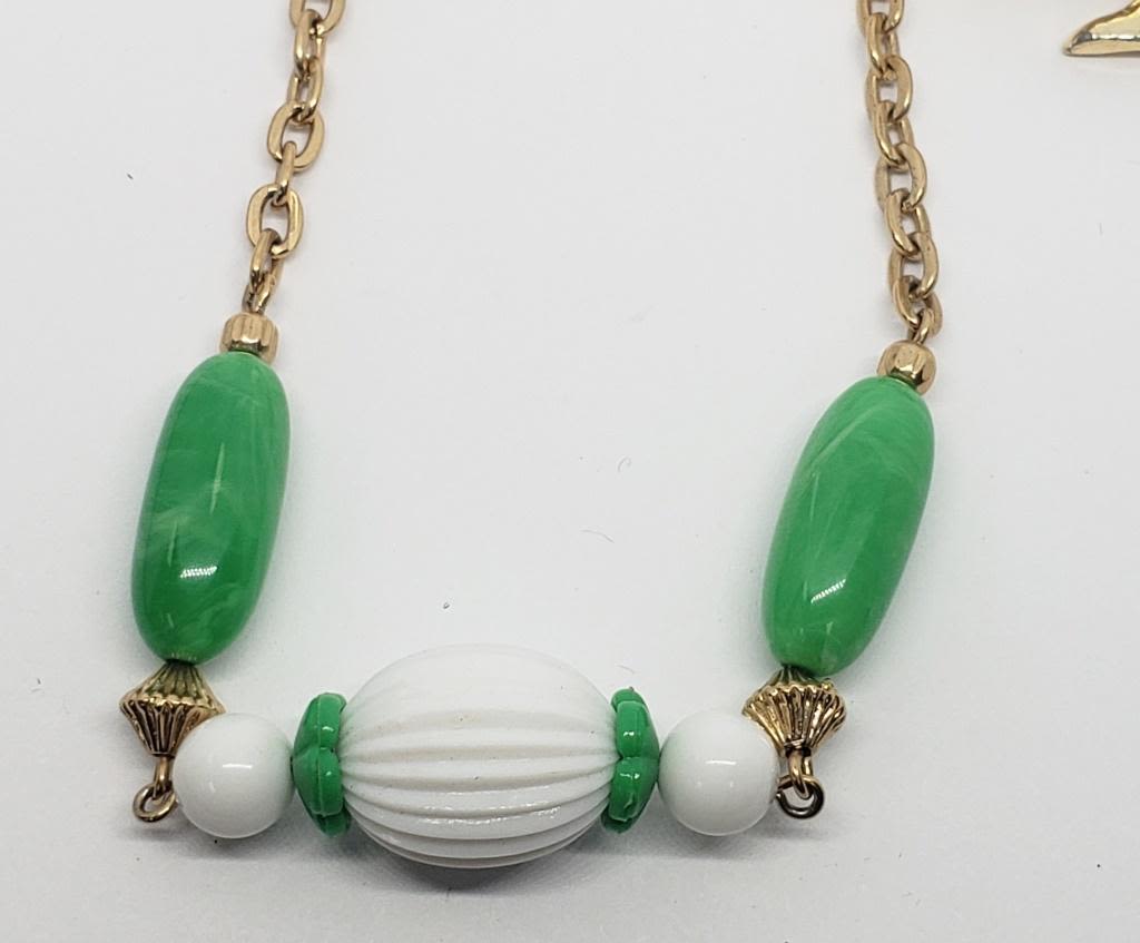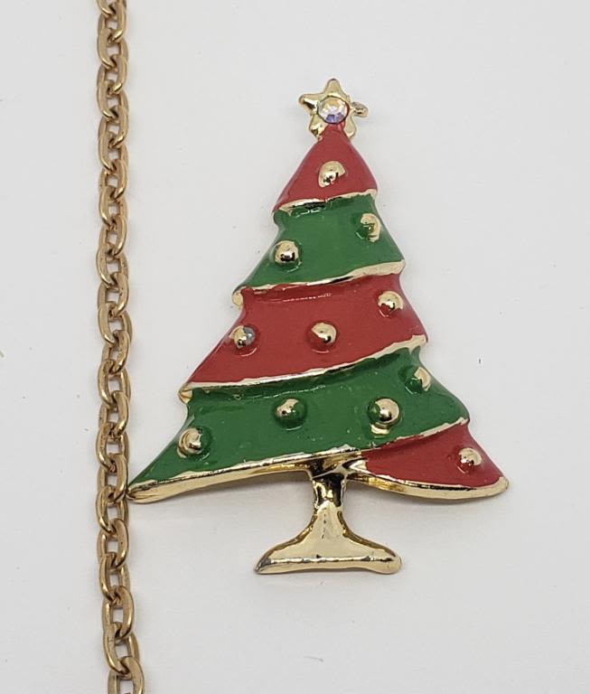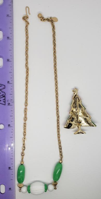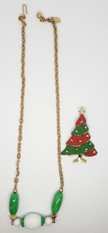 WHITE BEAD ACCENTS PLUSE (1)GOLD TONED CHRISTMAS TREE BROOCH WITH GREEN AND RED ENAMEL AND RHINESTONE STAR ACCENTS