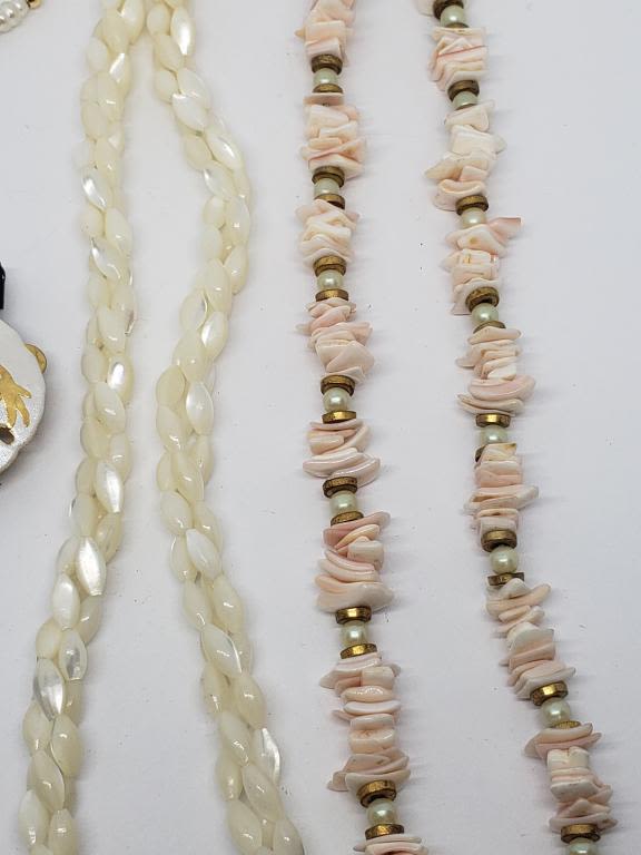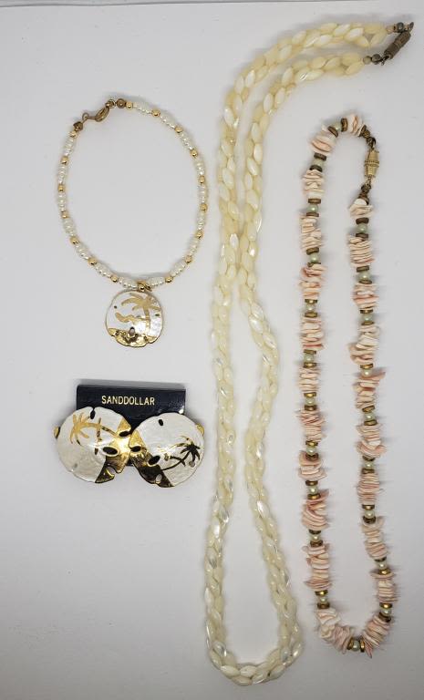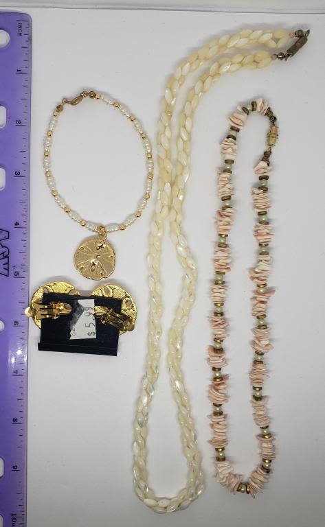 PEARL BRACELET & CLIP ON EARRINGS (1)BRAIDED BEADED NECKLACE & (1)PUKA SHEEL AND PEARL NECKLACE