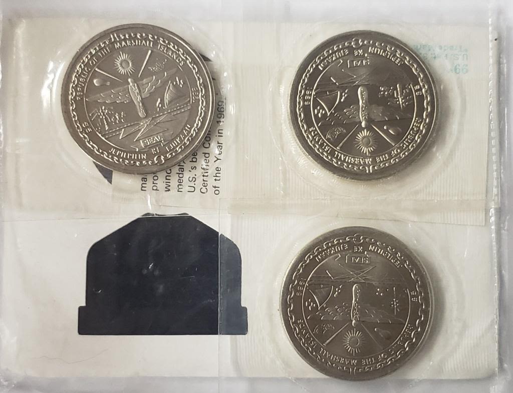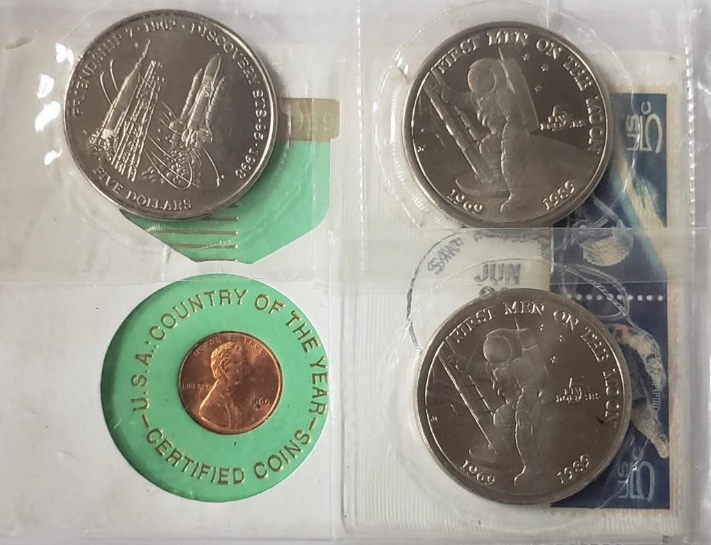 w/STAMPS & 1969 BU CENT, (2) FISRT MEN ON THE MOON MARSHALL ISLAND COINS, 1998 DISCOVERY MARSHALL ISLAND