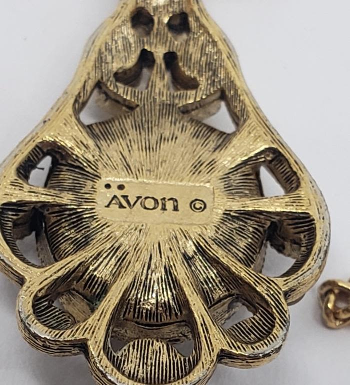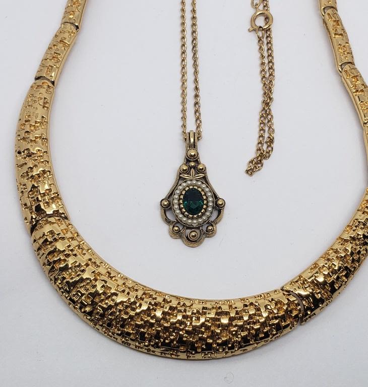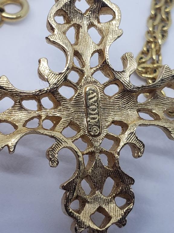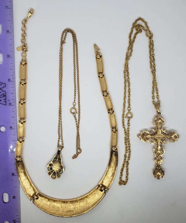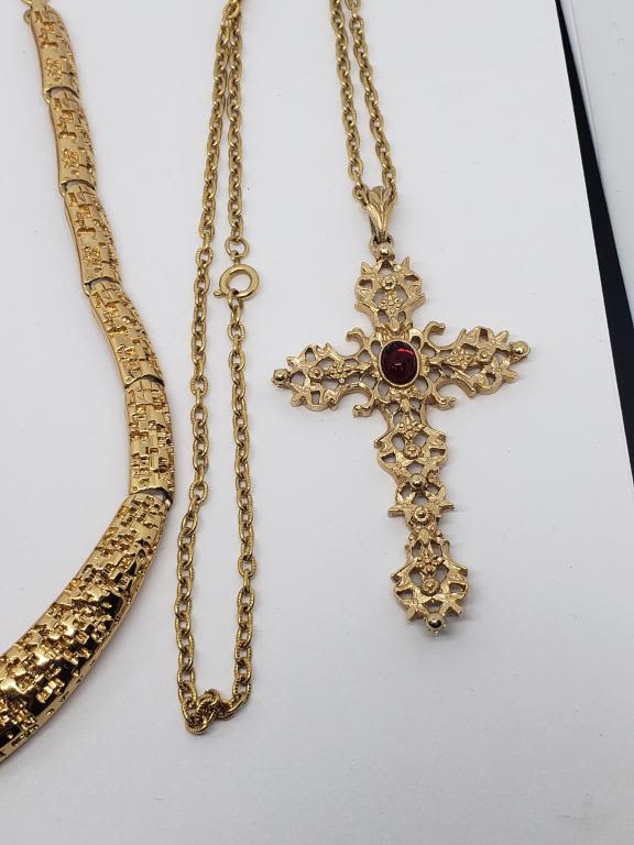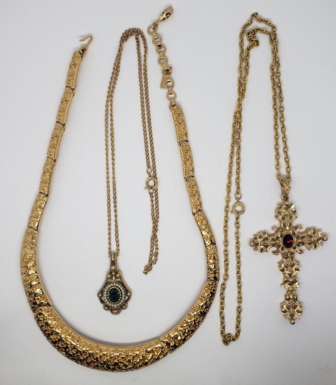 CROSS PENDANT WITH RED LUCITE CENTER (1)MONET CHUNKY! (1)AVON PENDNAT WITH GREEN RHINESTONE AND FAUX PEARLS