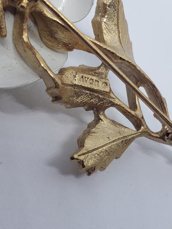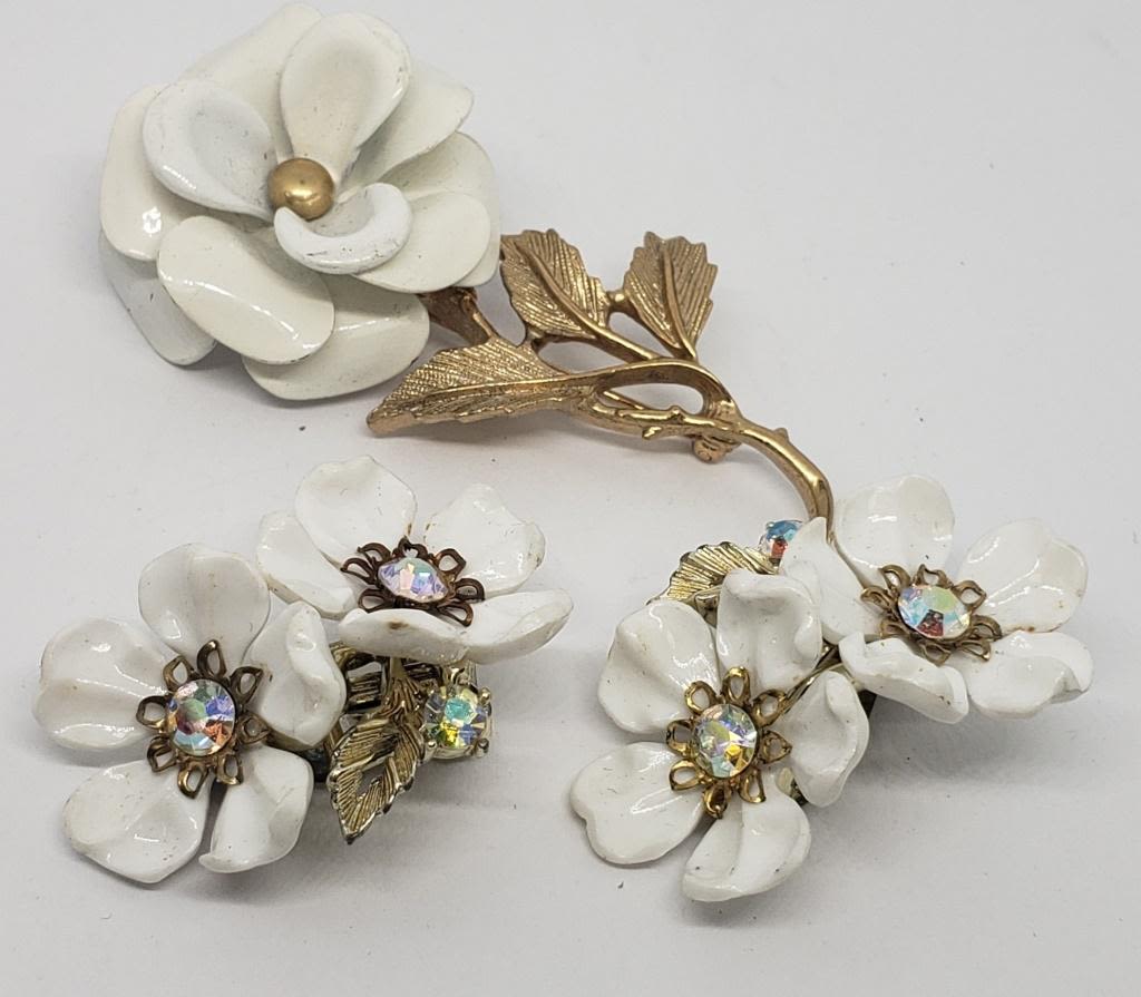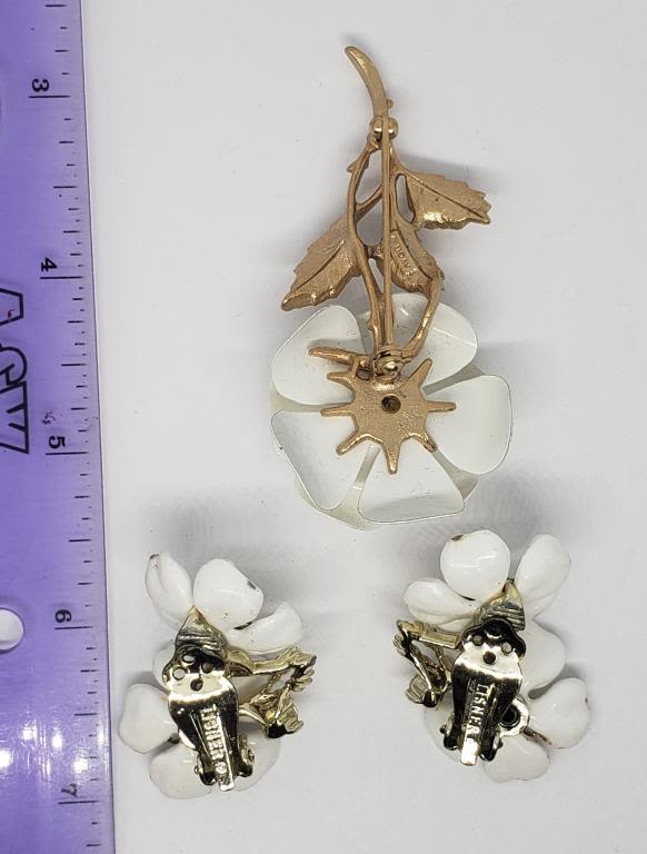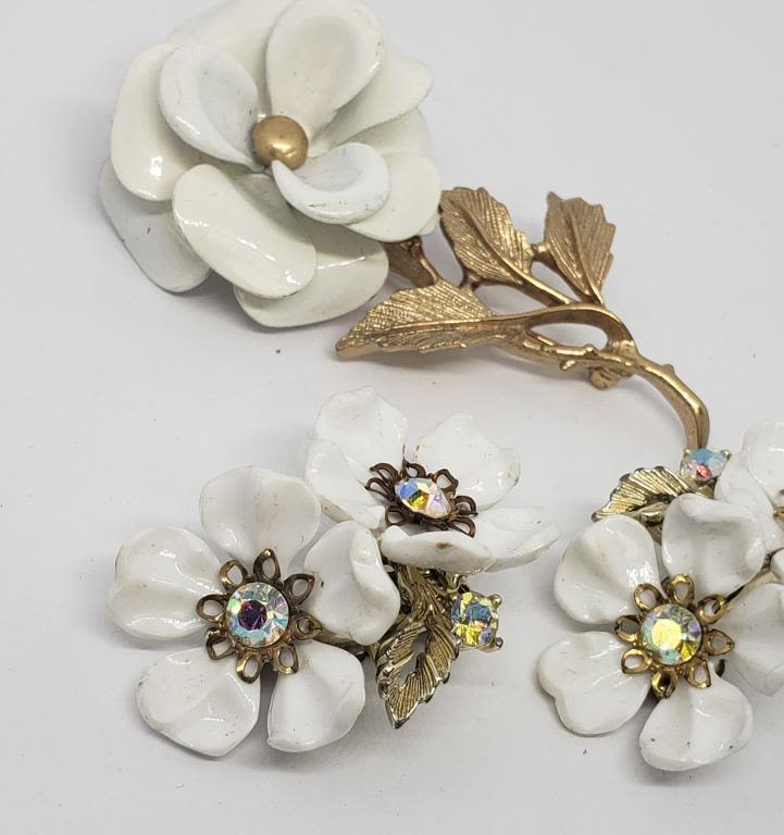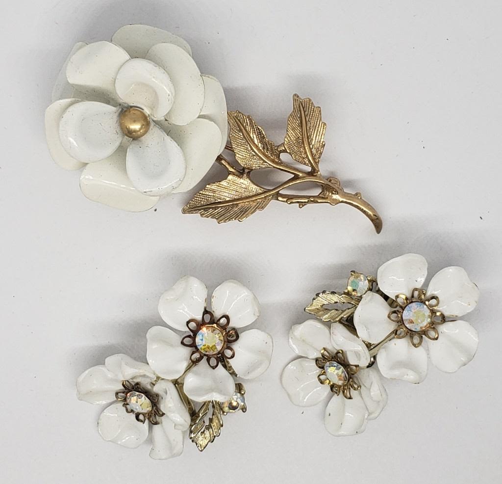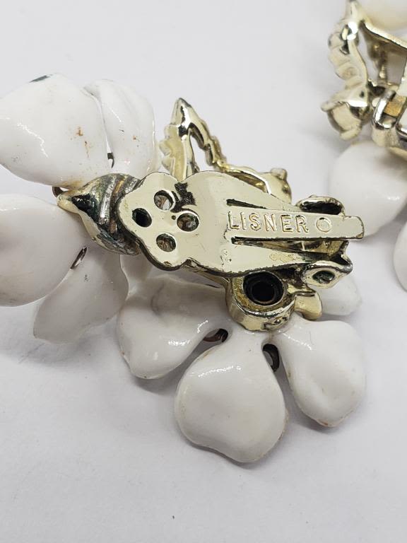 BROOCH PLUS (1)VTG LISNER PAIR OF GOLD TONED WHITE LUCITE FLOWER EARRINGS WITH RHINESTONES