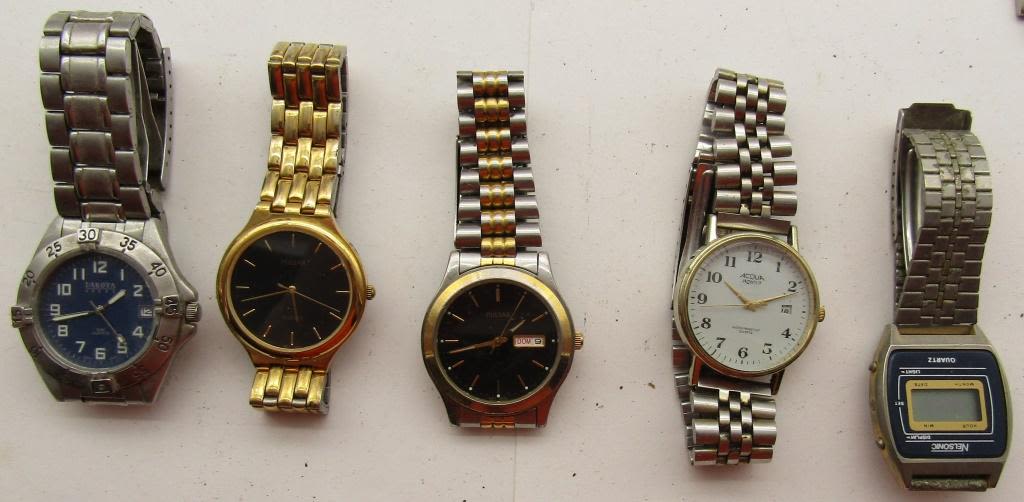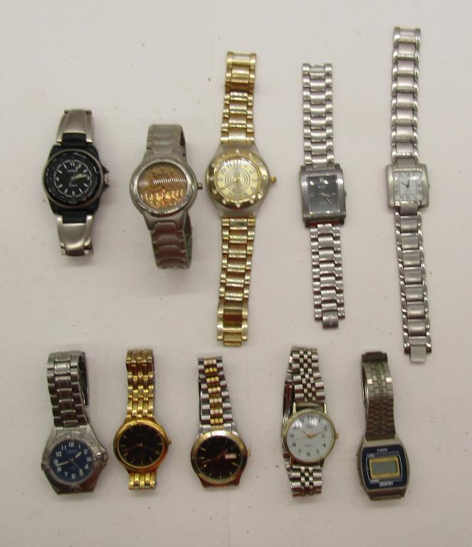 ALL UNTESTED: SOME MAY WORK, SOME MAY NOT, SOME MAY NEED BATTERIES, SOME FOR PARTS OR REPAIRS- 10 MENS QUARTZ WATCHES -MARCELO-(2)PULSAR-GENEVA-DAKOTA STEEL-RJ GRAZIANO-ACQUA-NELSONIC-RELIC-MISC