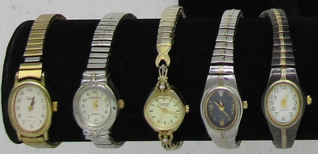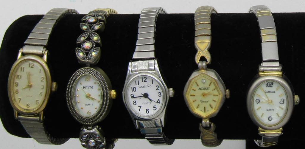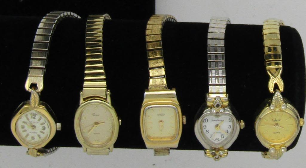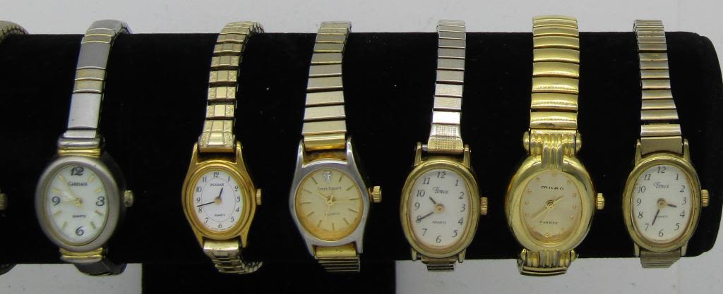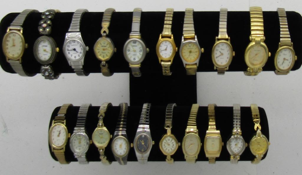 ALL UNTESTED: SOME MAY WORK, SOME MAY NOT, SOME MAY NEED BATTERIES, SOME FOR PARTS OR REPAIRS- 20 LADIES QUARTZ WATCHES-STRETCH BANDS-(5)TIMEX-CARRIAGE-HI TIME-PULSAR-CITIZEN-WATCH IT-(2)TIME