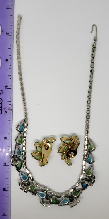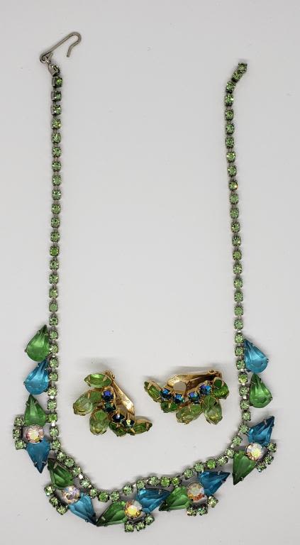 GREEN RHINESTONE FLOWER NECKLACE PLUS (1)PAIR OF GOLD TONED BABY BLUE AND ELECTRIC GREEN CLIP ON EARRINGS
