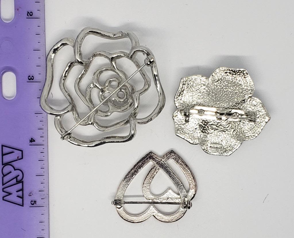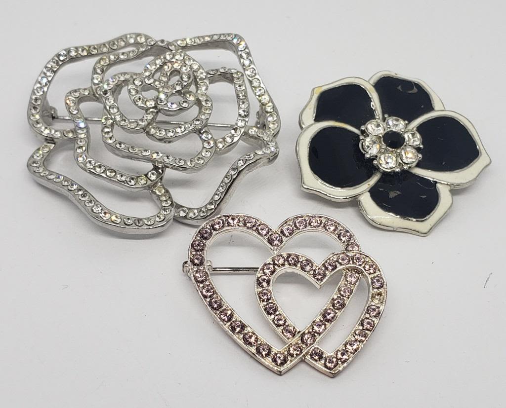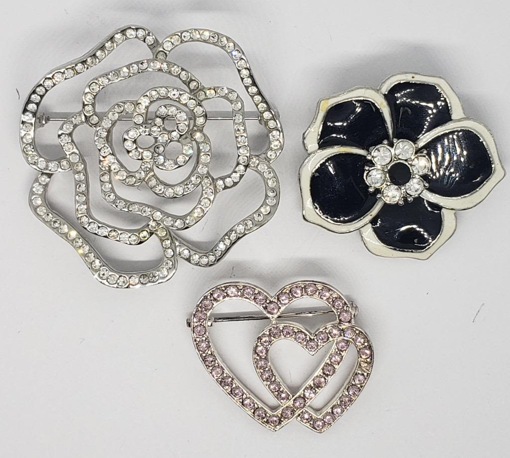 (2)FLOWER-(1)WITH BLACK AND WHITE ENAMEL (1)DOUBLE HEART WITH PINK RHINESTONES