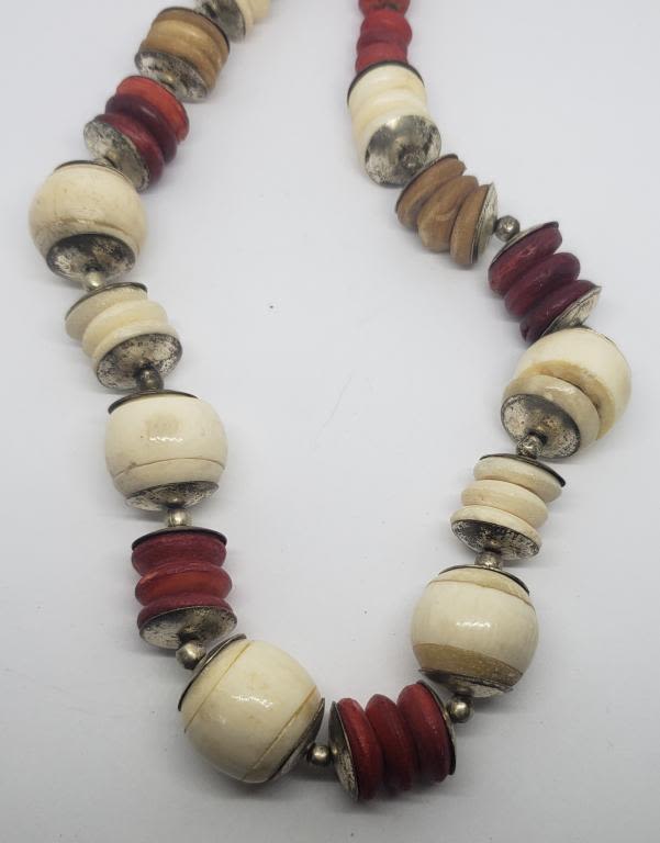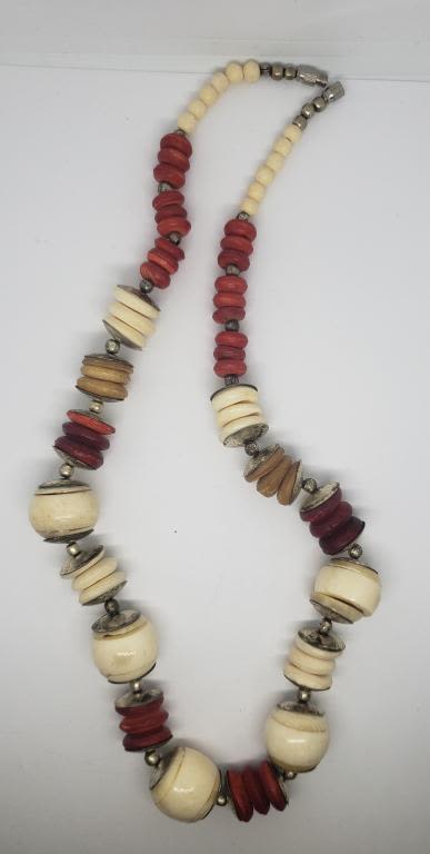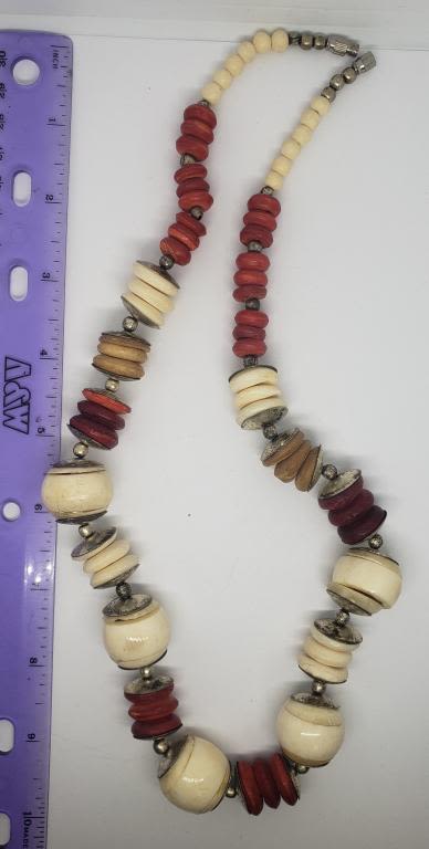 RED AND TAN WOODED BEADS THROUGHOUT-SILVER TONED BEAD ACCENTS