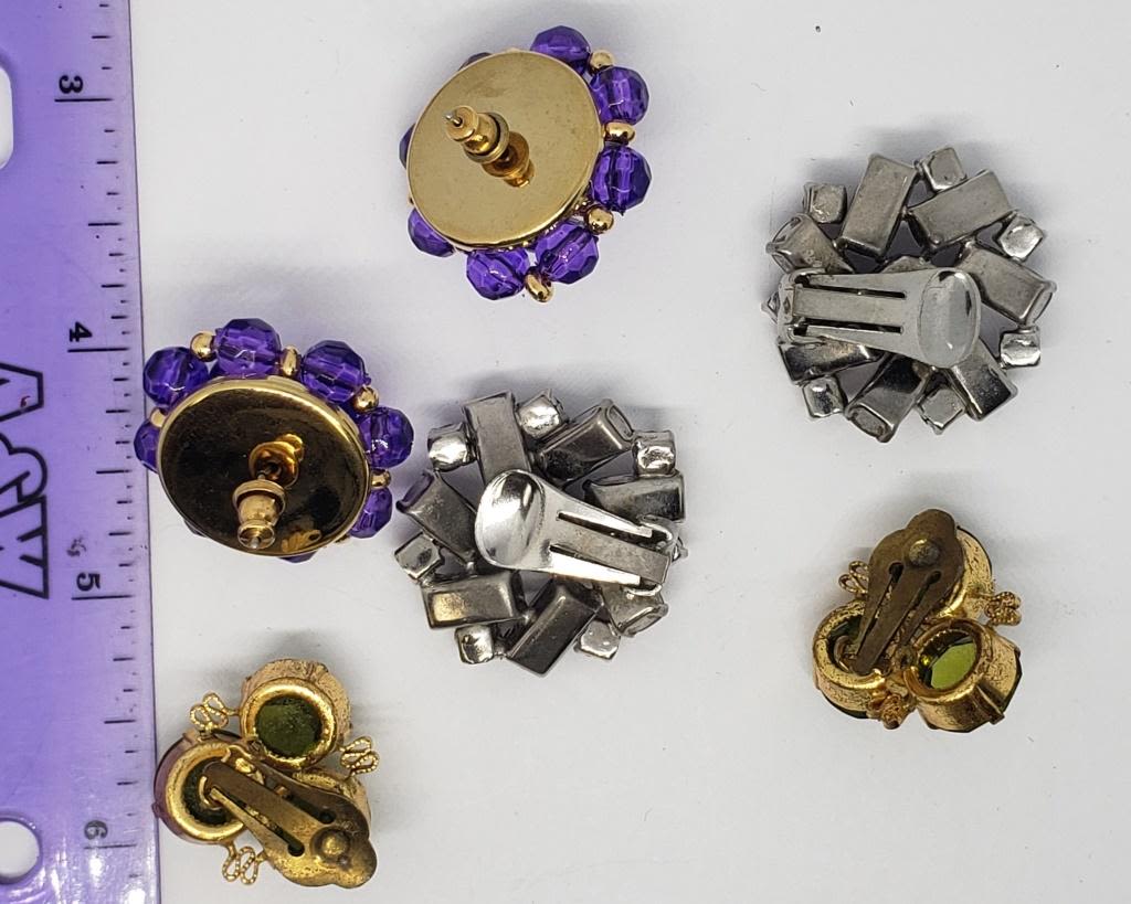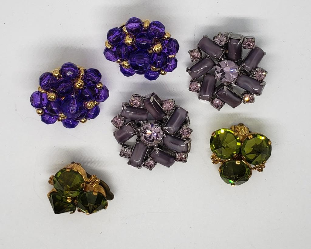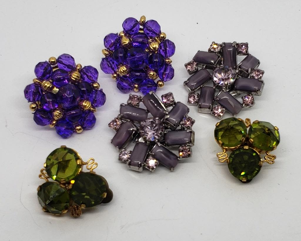 RHINESTONE AND LUCITE CLIP ON (1)GOLD TONED HUNTER GREEN RHINESTONE CLIP ON (1)GOLD TONED PIERCED WITH VIOLET BEADS