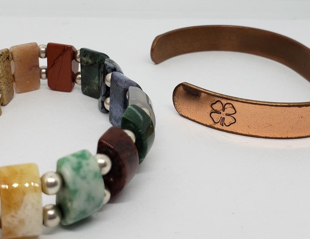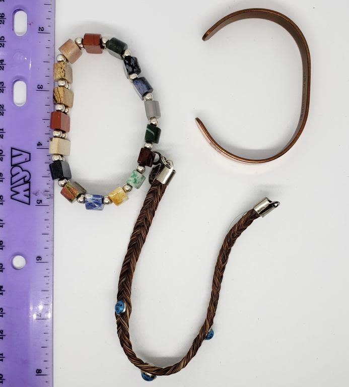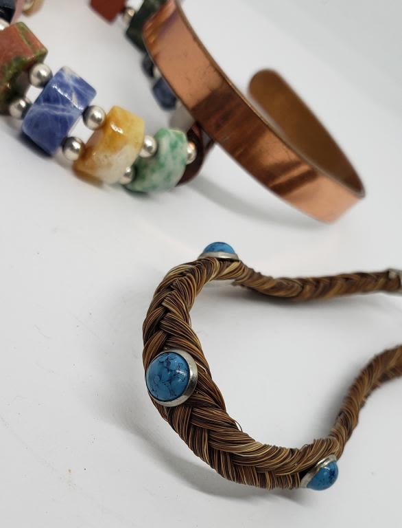 (1)BRAIDED WITH TURQUOISE LUCITE BEADS (1)COPPER CUFF WITH 4-LEAF CLOVER ENGRAVED (1)POLISHED NATURAL STONED STRETCHY BRACELET