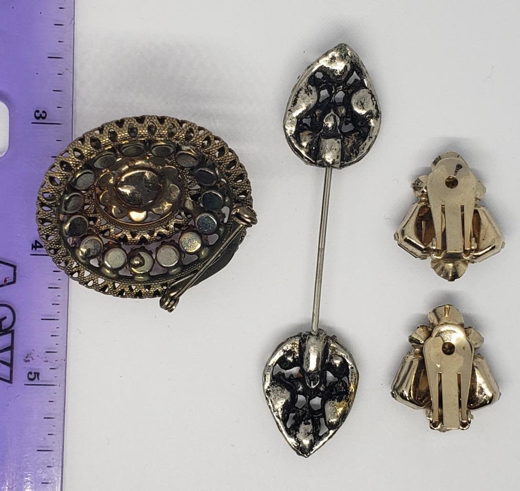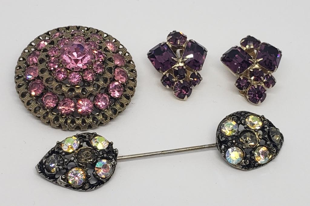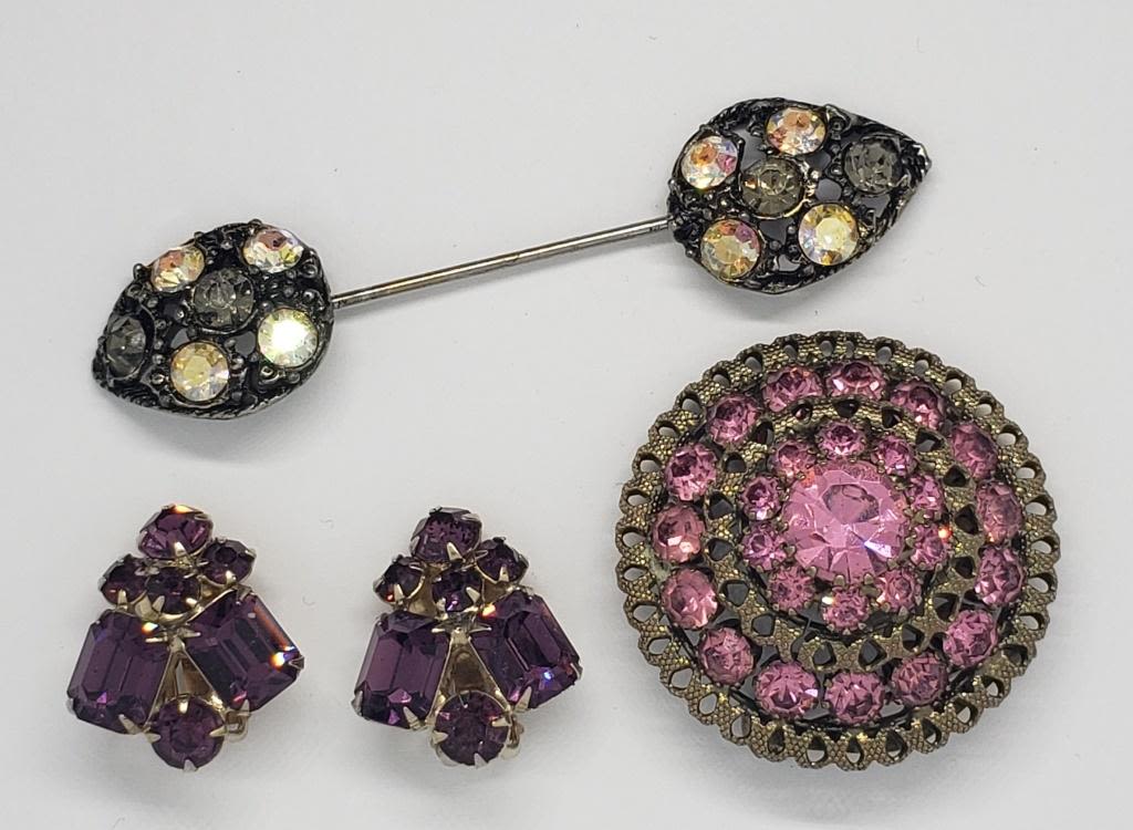 (1)DOME BROOCH WITH PINK RHINESTONES (1)STICK PIN WITH CLEAR RHINESTONES (1)PAIR OF CLIP ON EARRINGS WITH VIOLET RHINESTONES