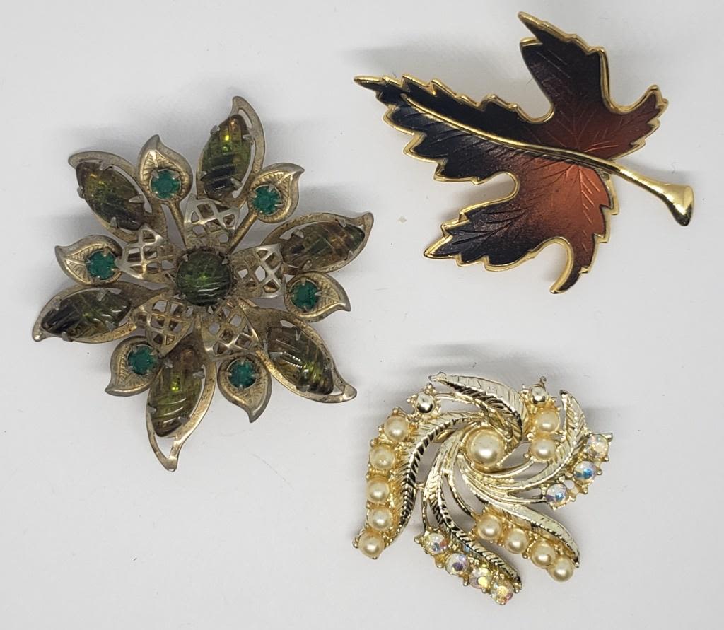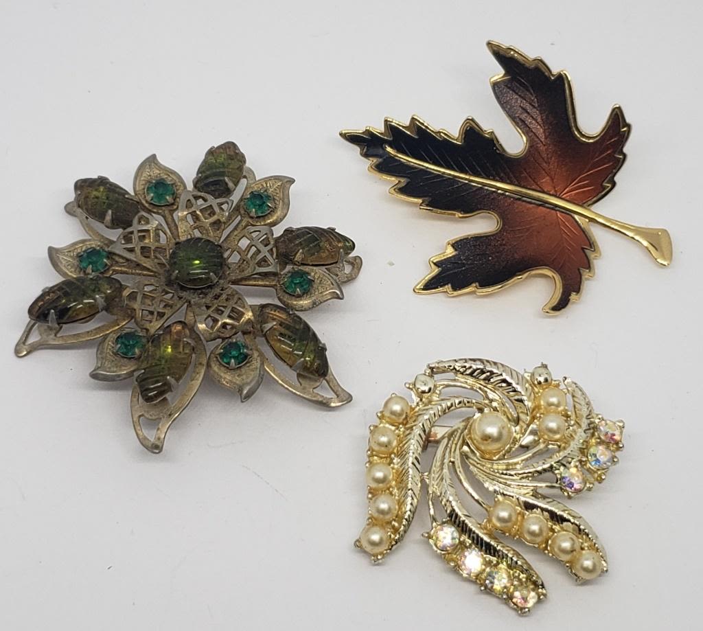 ENAMEL (1)GREEN RHINESTONES AND LUCITE (1)WITH FAUX PEARLS AND RHINESTONES