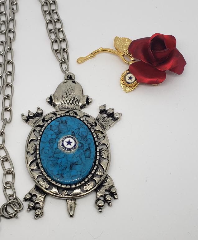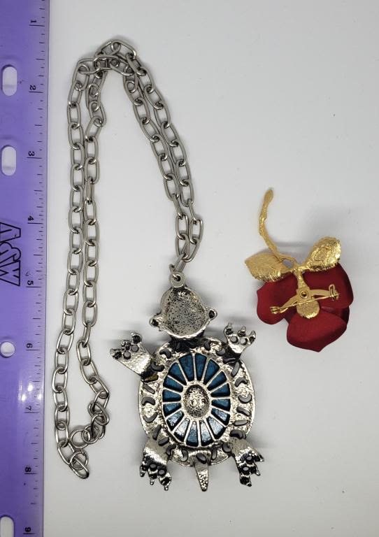 (1)GOLD TONED METAL ROSE BROOCH & (1)SILVER TONED TURTLE PENDANT WITH CHAIN-LARGE FAUX TURQUISE CENTER