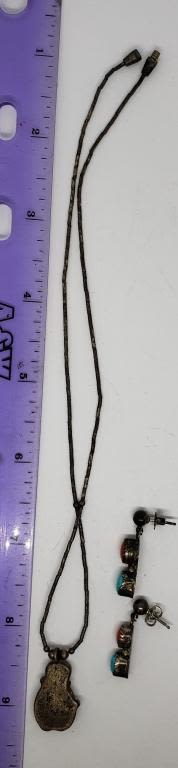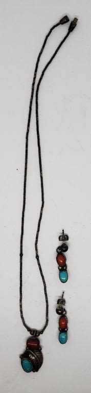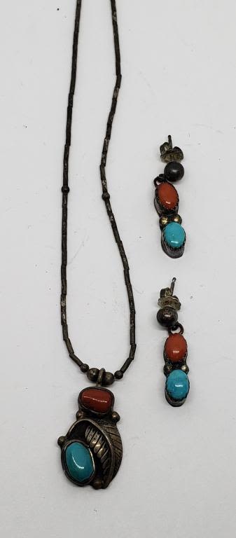 RED CORAL AND TURQUOISE STONES PLUS (1)PAIR DAVIS NAVAJO STERLING DANGLY PIERCED EARRINGS WITH RED CORAL AND TURQUOISE STONES-TOTAL 5.7 DWT